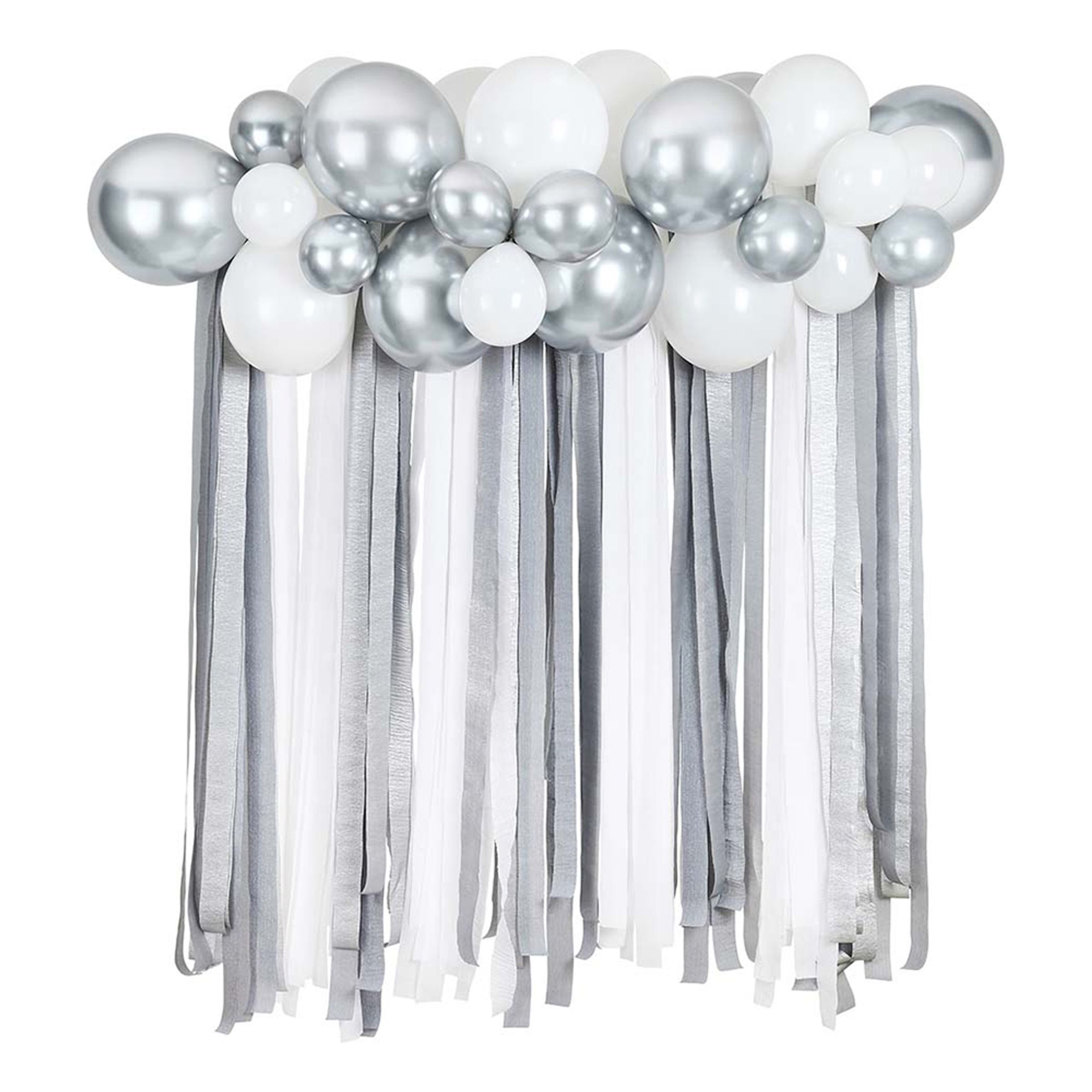 Ge festen en fantastisk backdrop med det här festliga kitet! Ballonger och streamers i en lyxig kombination som passar lika bra till överraskningsfesten som till studenten eller bröllopet med silver och vitt tema!