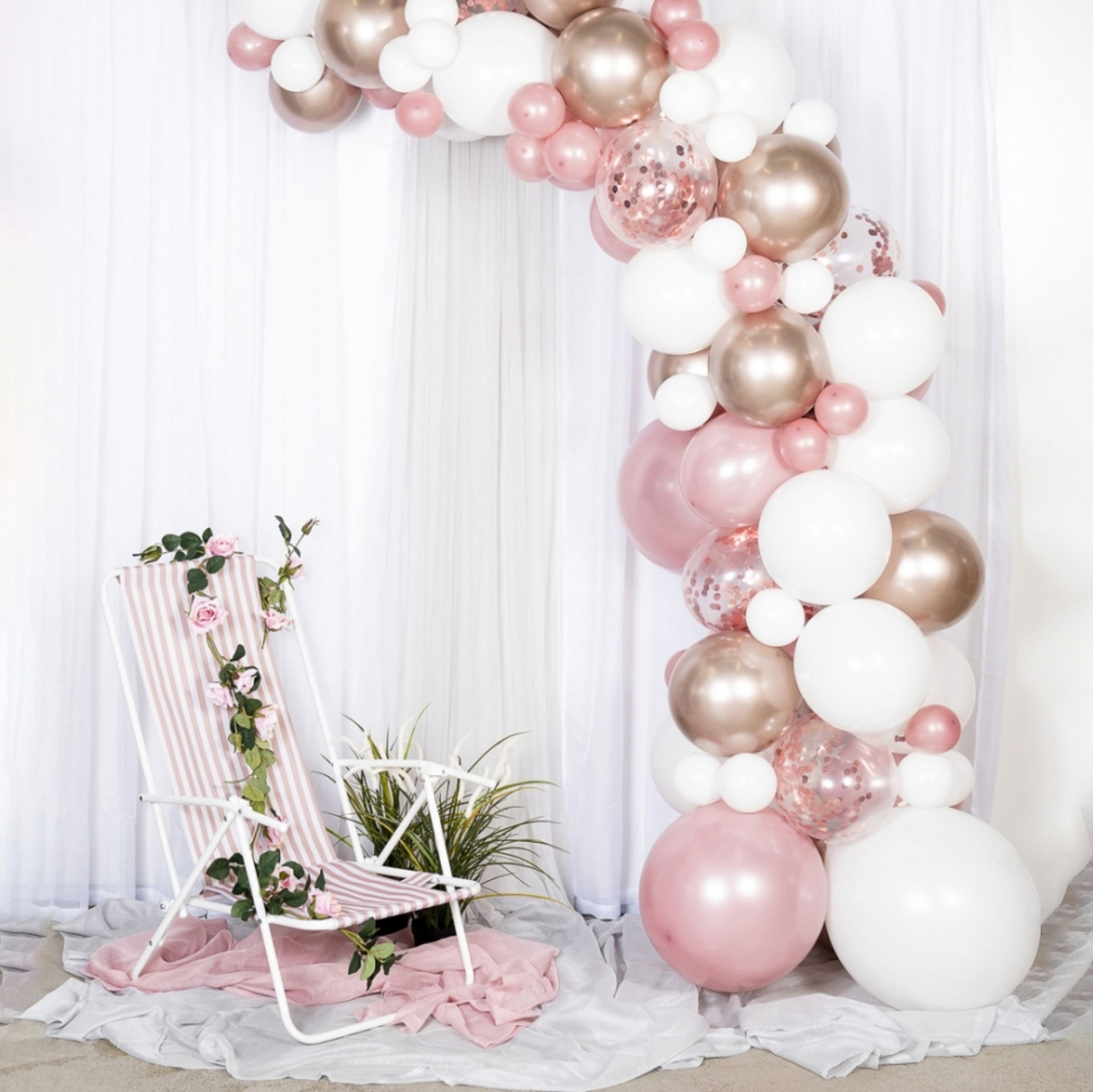 Ballongbåge Roséguld levereras komplett som kit för byggande av härlig ballongbåge i roséguld-tema. Kitet innehåller allt du behöver för en komplett ballongbåge i färgerna vit och roséguld. Monteringsanvisning på svenska och engelska medföljer.