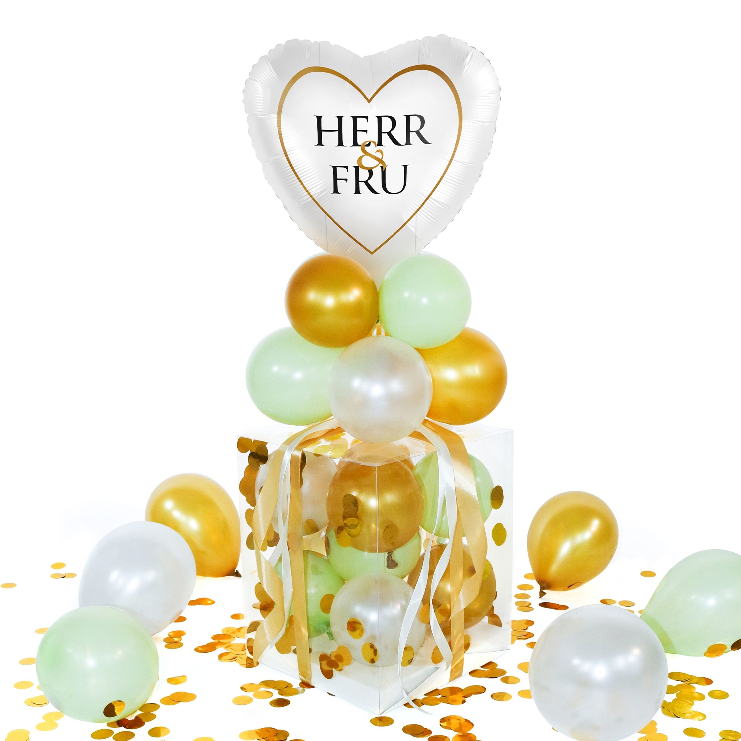 Ballongbox Herr och Fru är ett kit med ballonger och tillbehör för att skapa en vacker & dekorativ ballongbukett. Kitet består av en transparent presentlåda, gröna guldiga och vita latexballonger, samt en folieballong med texten "Herr och fru". Dessutom kommer kitet med konfetti i silver och tylltyg i matchande färger. Instruktioner medföljer.