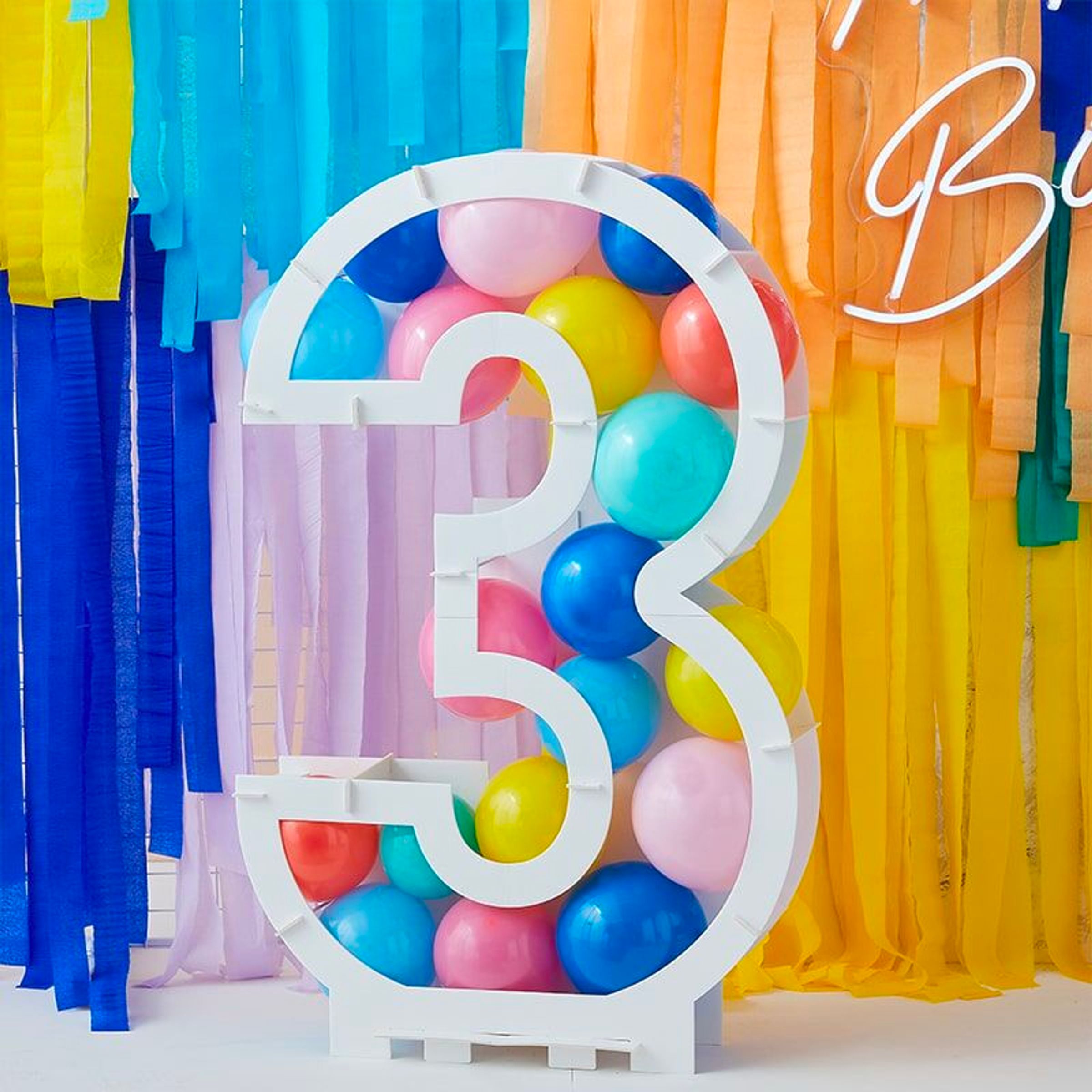 Den ultimata dekorationen på födelsedagsfesten! Istället för att låta ballongerna sväva i taket skapar du snygga kreationer med hjälp av våra stilrena sifferboxar. Fyll siffrorna med ballonger i födelsedagsbarnets favoritfärger för att maxa firandet och skapa en minnesvärd detalj på festen!
