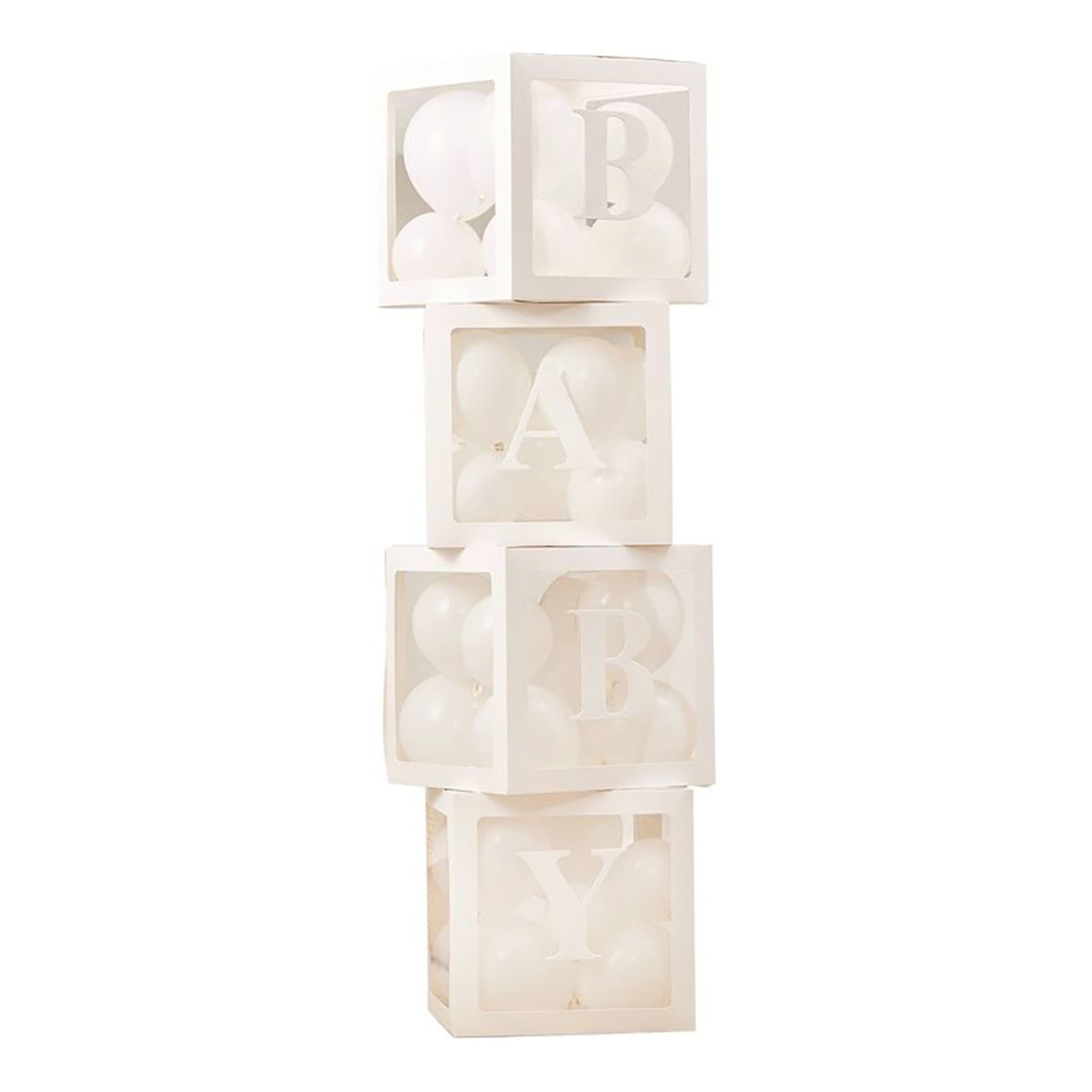 Ballongboxar Baby med Ballonger Vit innehåller 4 stycken vita dekorativa boxar av papp- och plastmaterial, samt 60 st vita miniballonger i latex som mäter uppblåsta ca 10-12 cm stora att fylla boxarna med. Även 4 st bokstavsstickers medföljer som du fäster på boxarna; 2 st "B", 1 st "A" och 1 st "Y". Lådorna mäter 30 x 30 x 30 cm stora.