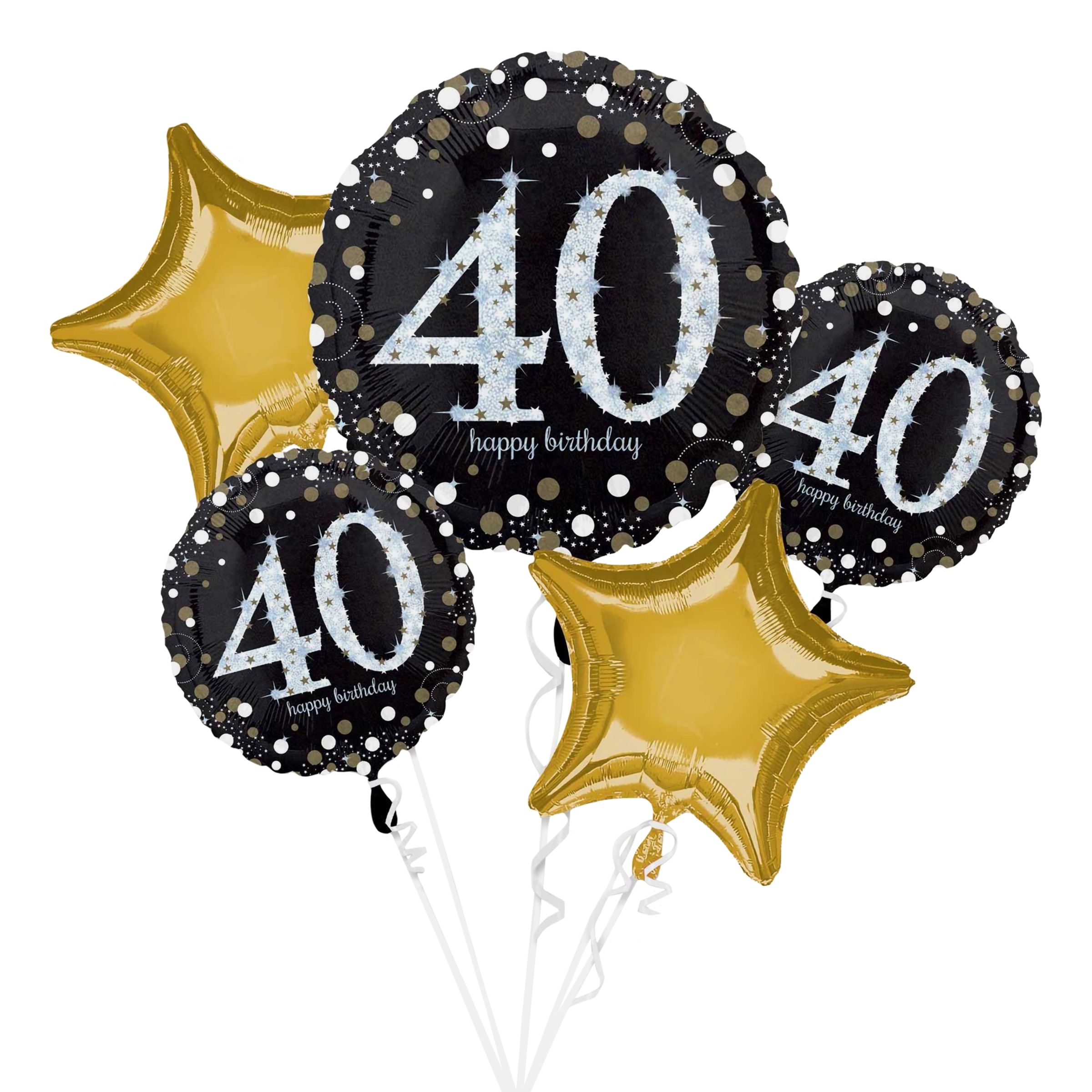 Ballongbukett Happy Birthday 40 Glittrande består av två guldfärgade stjärnballonger och tre runda folieballonger i svart med siffran 40 tryckt i glittrande silver samt texten "Happy birthday". En av de runda ballongerna är lite större vilket gör ballongbuketten extra effektfull och häftig.