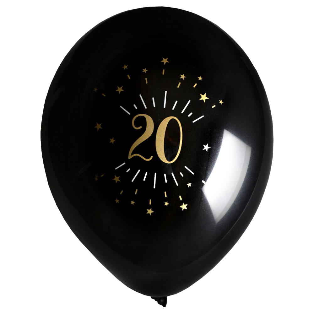 Ballonger 20 År Birthday Party Guld omfattar ett 8-pack svarta latexballonger med guldigt 20-års motiv. Ballongerna fylls med luft eller helium och blir ca 23 cm stora.