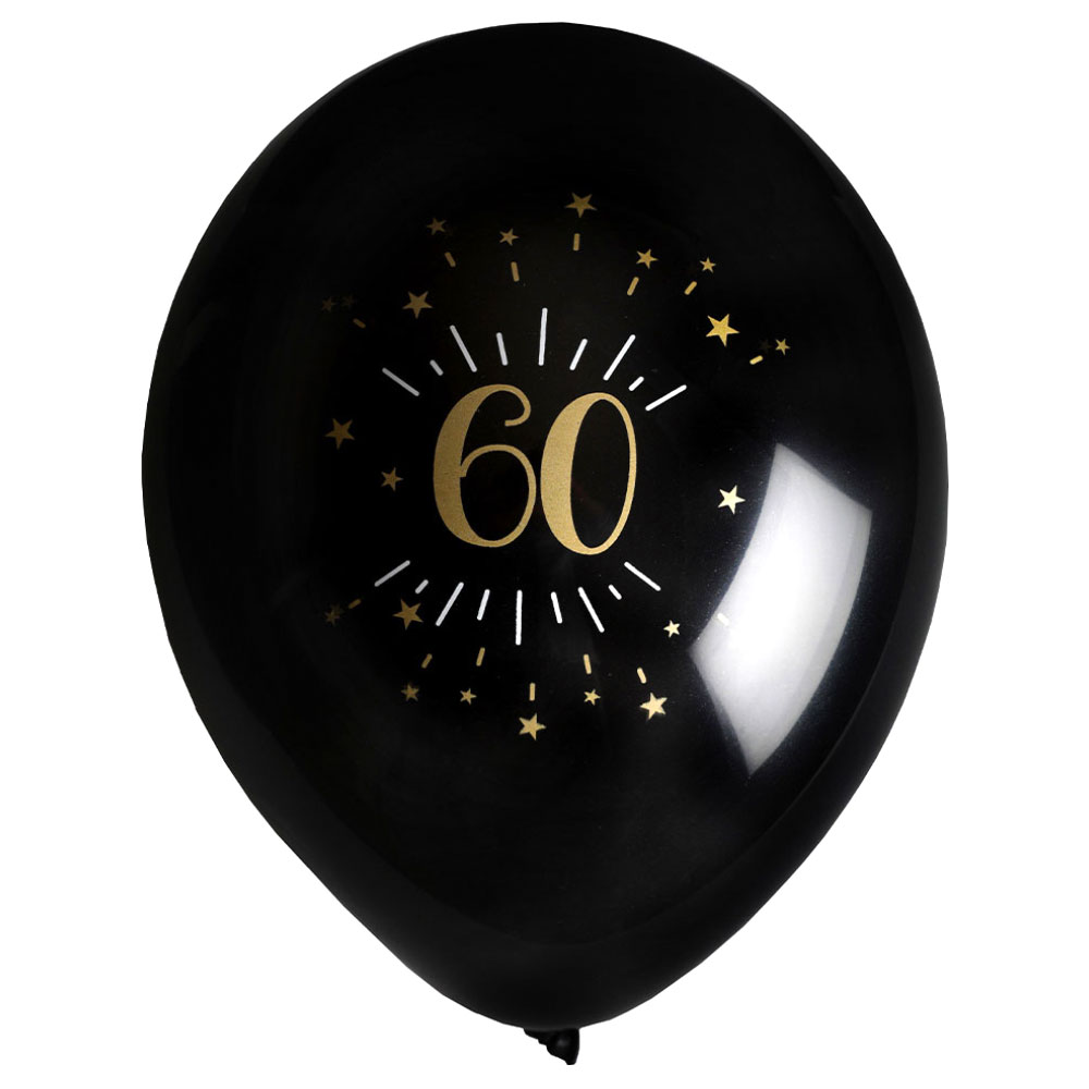 Ballonger 60 År Birthday Party Guld omfattar ett 8-pack svarta latexballonger med guldigt 60-års motiv. Ballongerna fylls med luft eller helium och blir ca 23 cm stora.