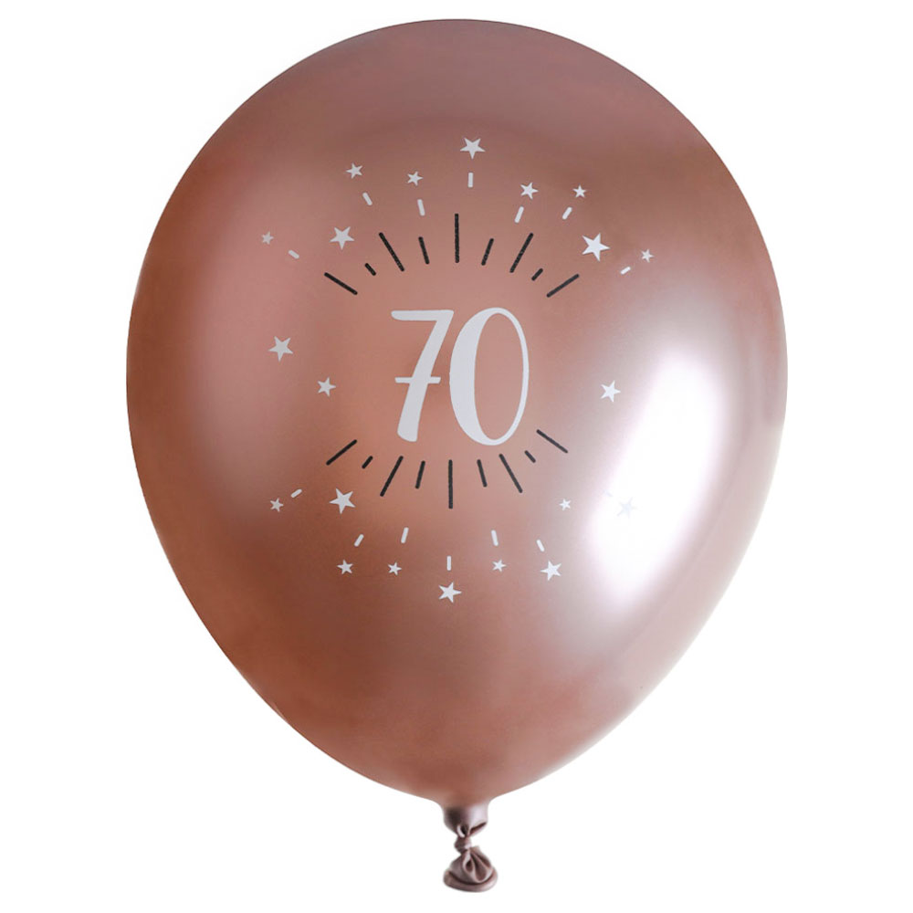 Ballonger 70 År Birthday Party Roseguld omfattar 6 stycken roseguldiga ballonger med dekorativt 70-års motiv. Ballongerna fylls med luft eller helium och blir ca 30 cm stora.