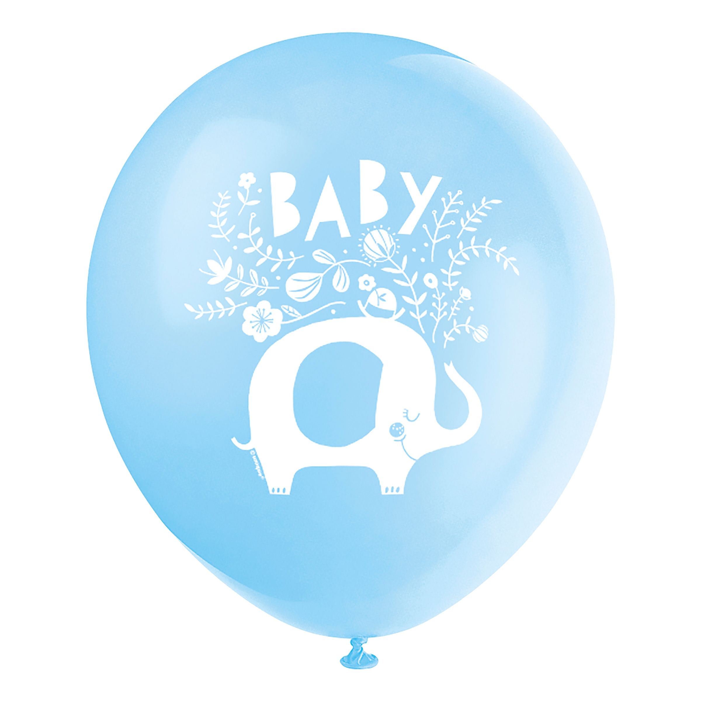 Ballonger Blå Baby Elefant innehåller 8 st blåa ballonger med en elefant, blommor och texten “baby” tryckt i vitt. Perfekt på babyshower, Gender Reveal eller dop.