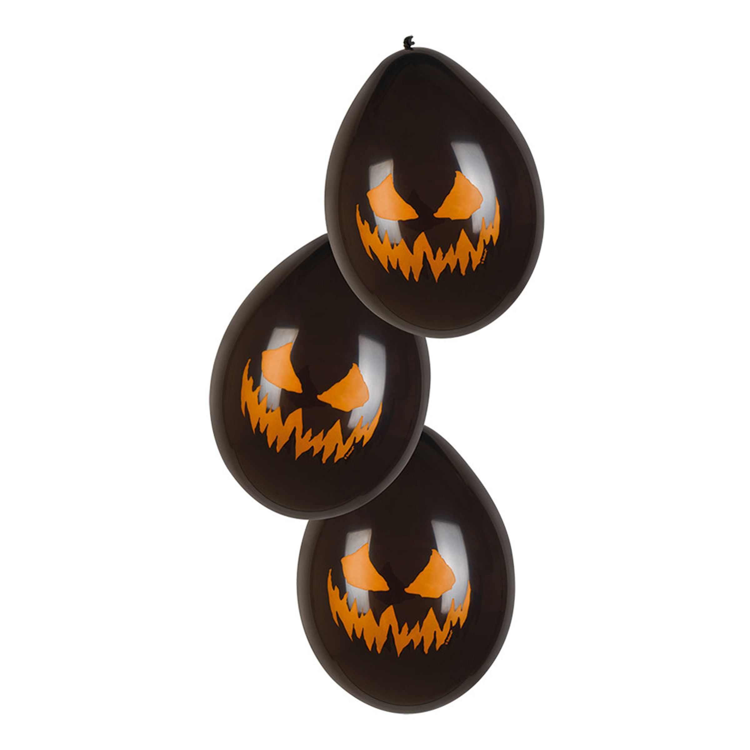 Ballonger Läskig Pumpa är svarta ballonger med orangefärgat motiv av en halloweenpumpas ögon och mun. Latexballongerna mäter ca 25 cm stora när de är uppblåsta.