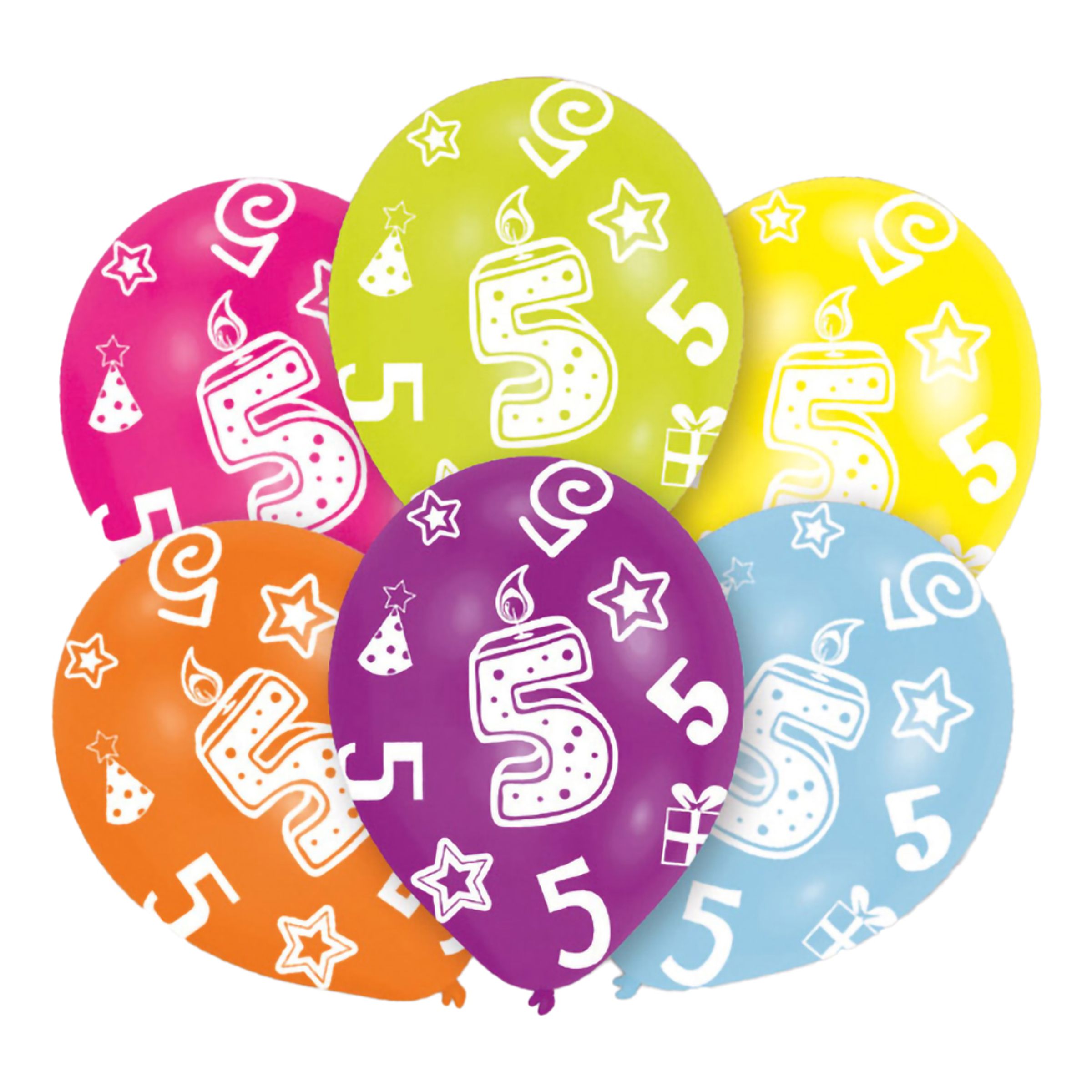 Ballonger Flerfärgad 5 År inkluderar sex stycken latexballonger med siffran 5 på. Ballongerna kommer i olika färger med vita motiv. Perfekt att dekorera med på 5-årsdagen! Ballongerna passar utmärkt att fyllas med helium för svävande effekt, vilket du givetvis hittar hos oss.