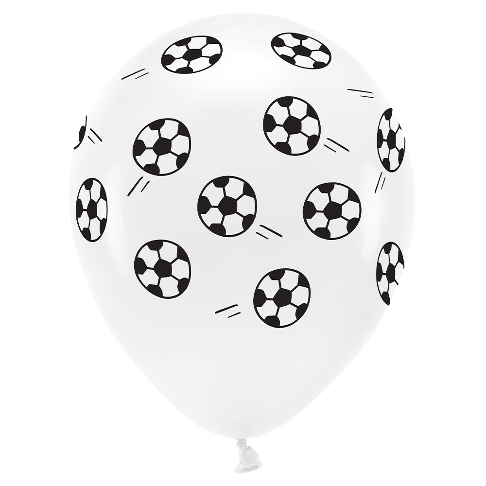 Ballonger Fotboll Eco omfattar 6 st vita latexballonger med svarta fotbollsmotiv. Ballongerna är biologiskt nedbrytbara, fylls med luft eller helium och blir ca 33 cm stora.