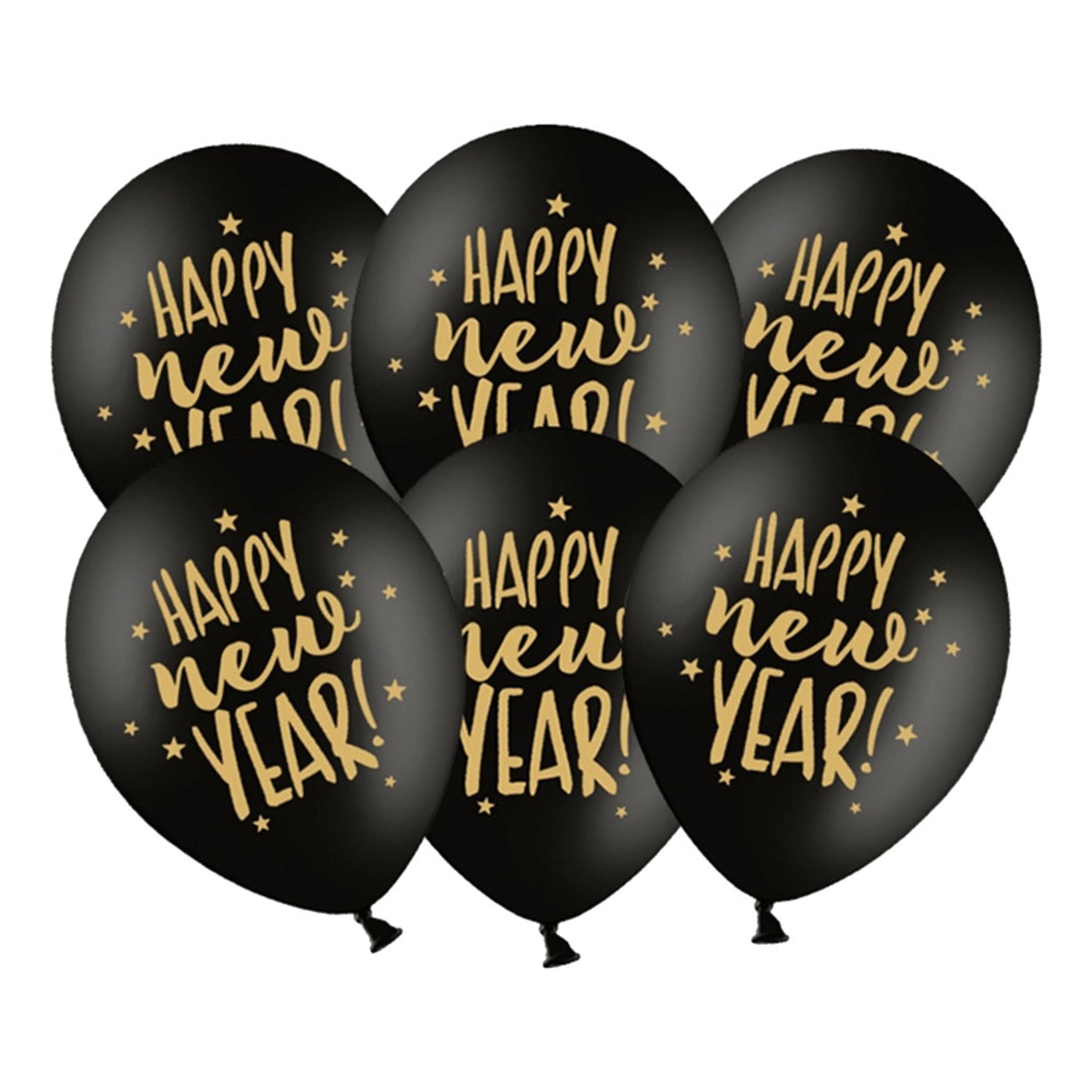 Ballonger Happy New Year Svart/Guld kommer i ett paket med sex stycken svarta ballonger med en guldfärgad text och små guldfärgade stjärnor. Ballonger är ca 25 cm när de är uppblåsta. Flygtid med helium är upp till 6 timmar. Komplettera gärna med en ballongpump eller med en tub med helium.