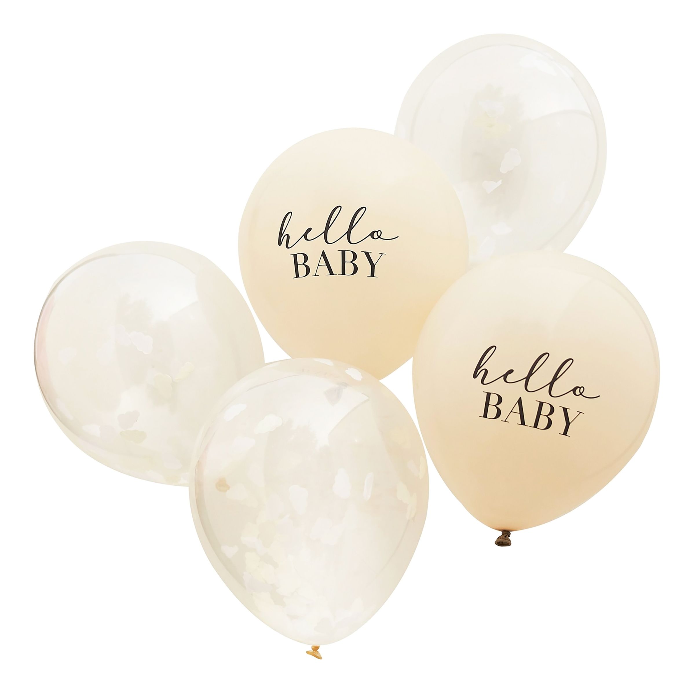 Ballonger Hello Baby Mix innehåller 5 tjusiga ballonger varav 2 stycken är beiga med texten "Hello Baby" och 3 stycken transparenta ballonger med konfetti. Matcha tillsammans med dekorationer i liknande neutrala toner, eller tillsätt pastelliga färger för ett fint resultat!