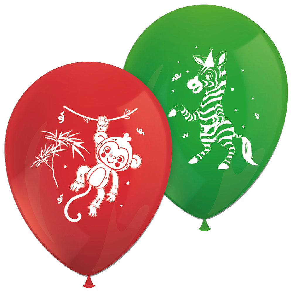 Ballonger Jungle Party omfattar 8 st röda och gröna latexballonger med vita motiv av apor och zebror. Ballongerna fylls med luft eller helium och blir ca 28 cm stora.