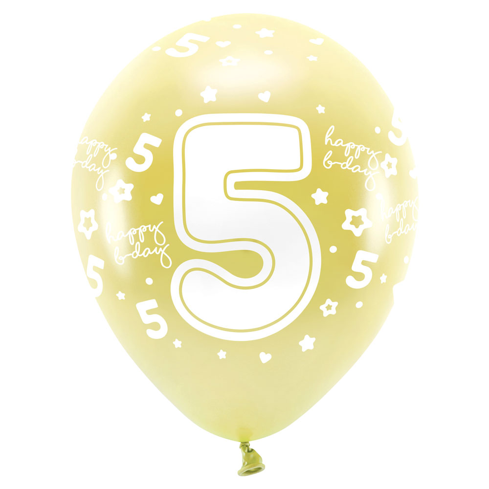 Ballonger Metallic Guld Happy B-day 5 omfattar ett pack med 6 stycken biologiskt nedbrytbara latexballonger i guld metallic med motiv av siffran 5 och texten "Happy B-day" i vitt. Ballongern är ca 30 cm stora, fylls med helium eller luft och rymmer ca 15 liter.