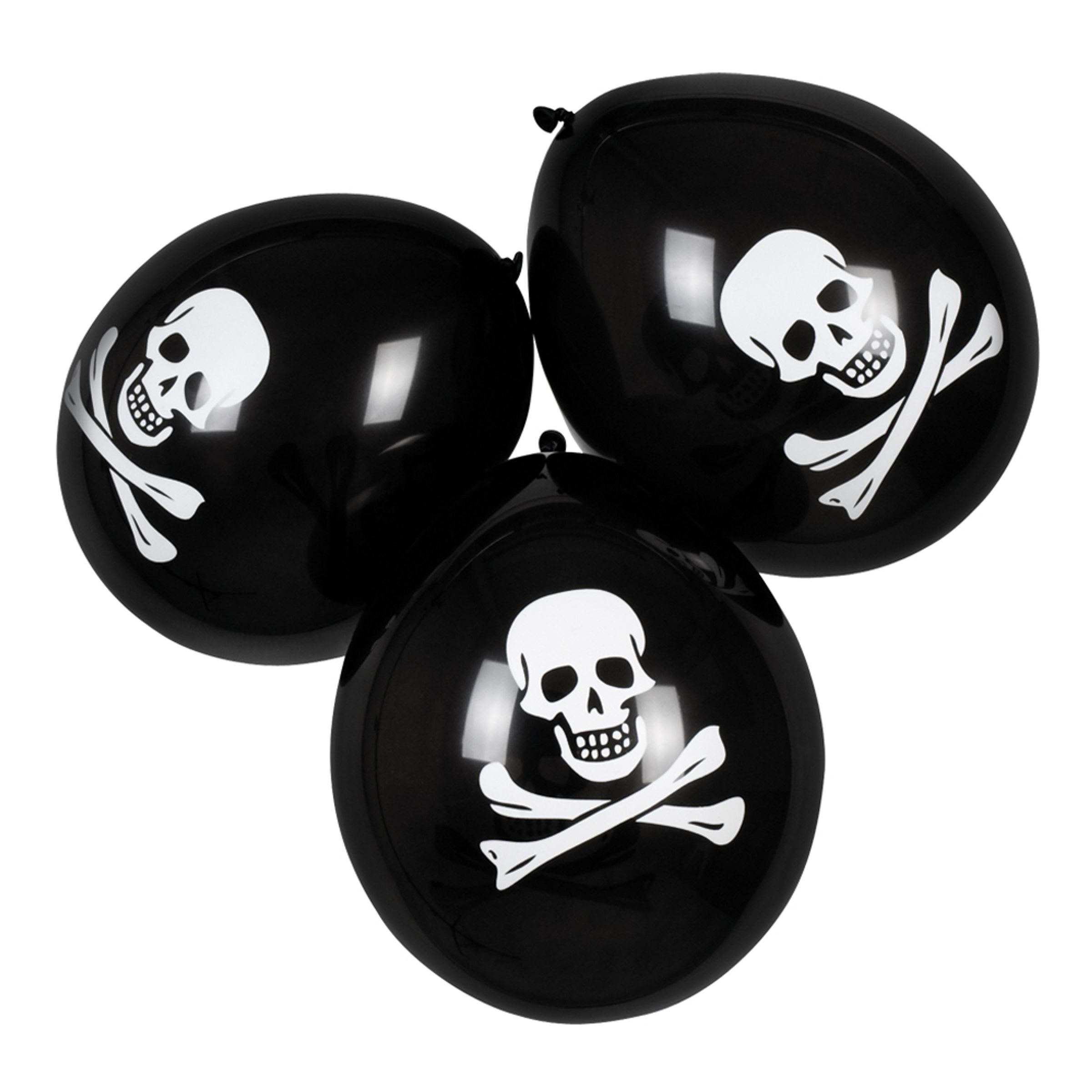 Ballonger Pirat är svarta ballonger av latex med ett vitt motiv av den klassiska piratloggan Jolly Roger. Levereras i 6-pack.