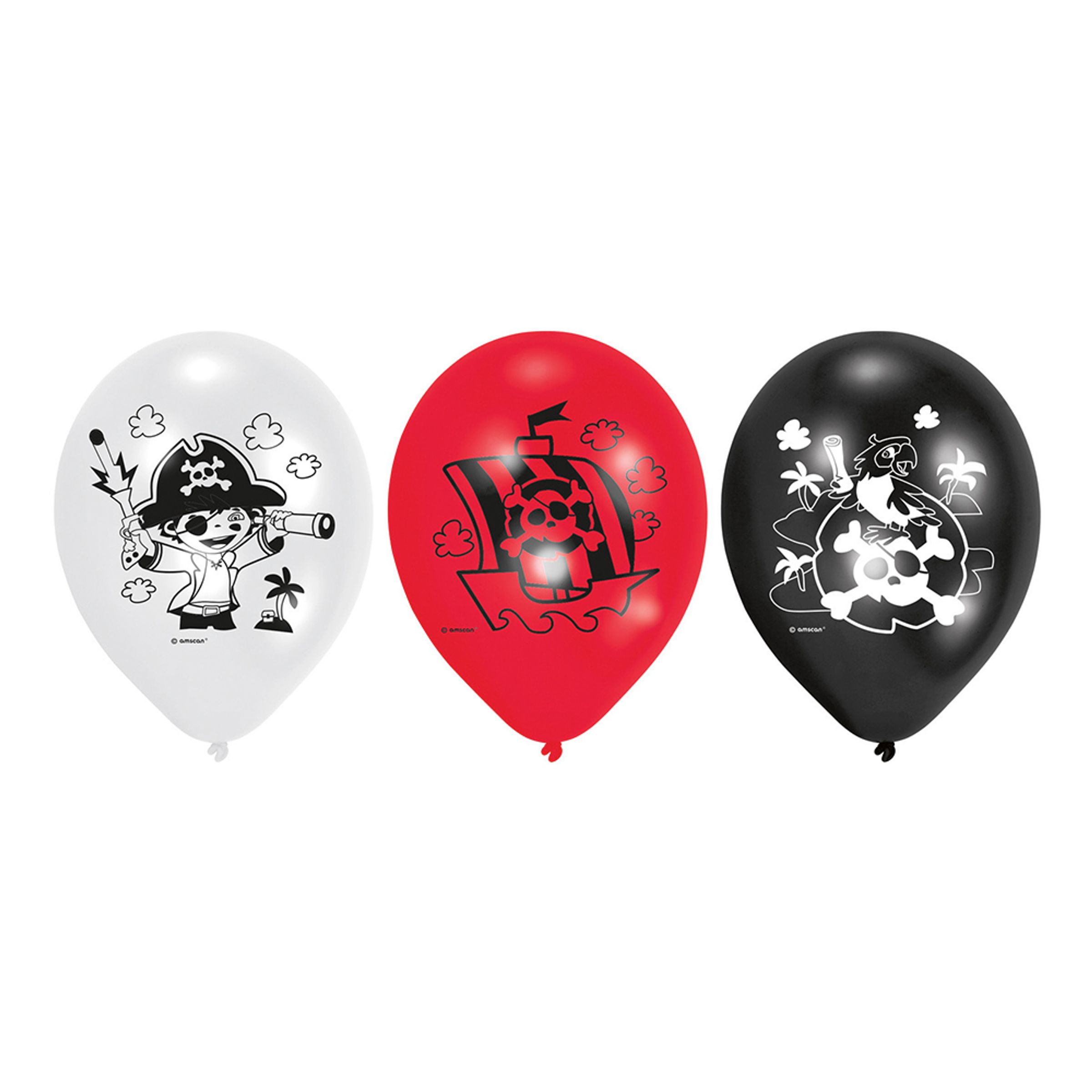 Ballonger Pirat Röd/Vit/Svart är ett paket med sex ballonger, två av varje färg. Du kan välja att fylla dem med luft eller med helium, om du väljer det sistnämnda flyger de i upp till 6 timmar.