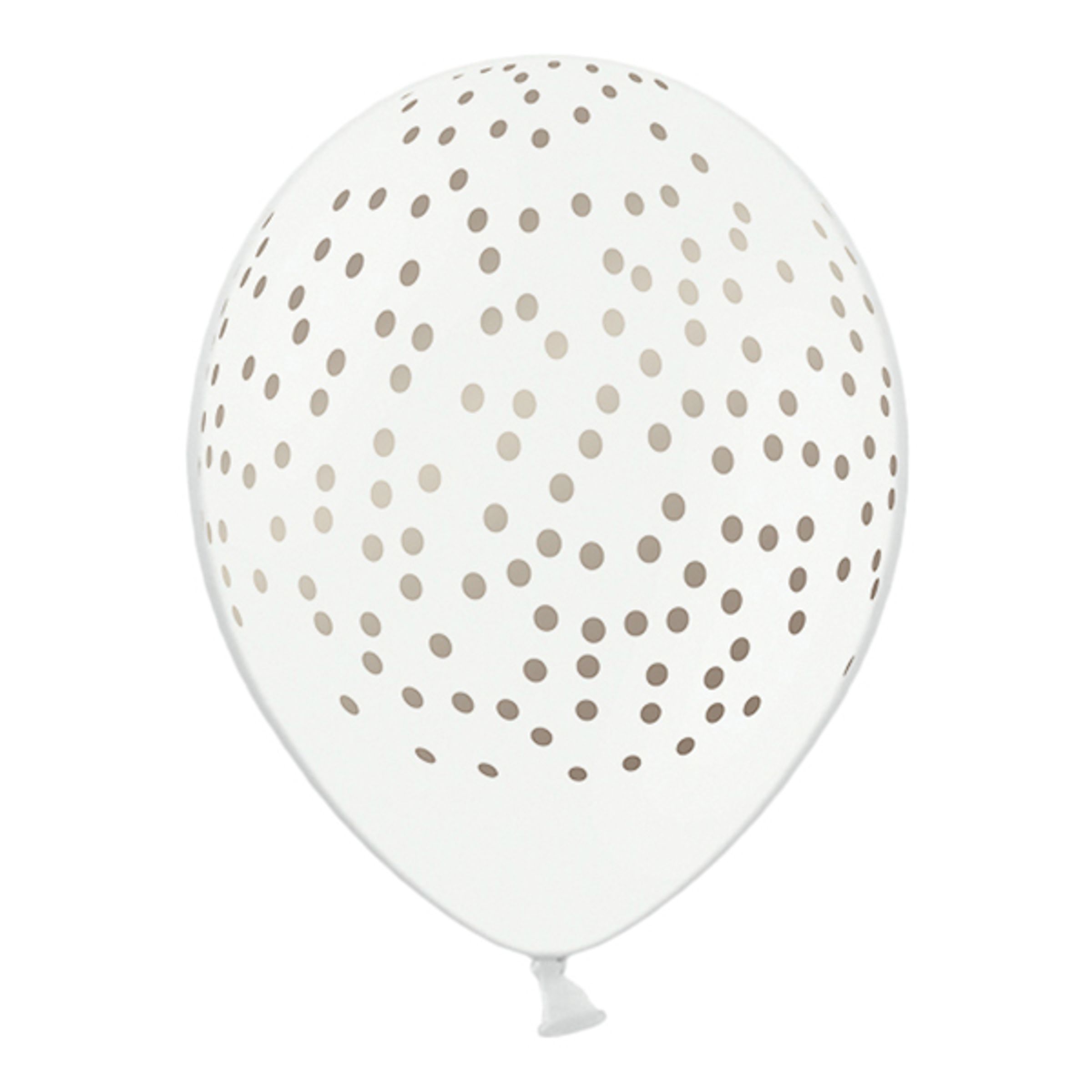 Alla kalas behöver ballonger! De här vita ballongerna med silverfärgade prickar i ett oregelbundet mönster ger festlokalen en elegant och tjusig känsla. De passar lika bra på ett bröllop som på en babyshower, ett dop, ett födelsedagskalas eller på ett nyårsparty. Dekorera med ballongerna över hela festlokalen och sprid en härlig feststämning!