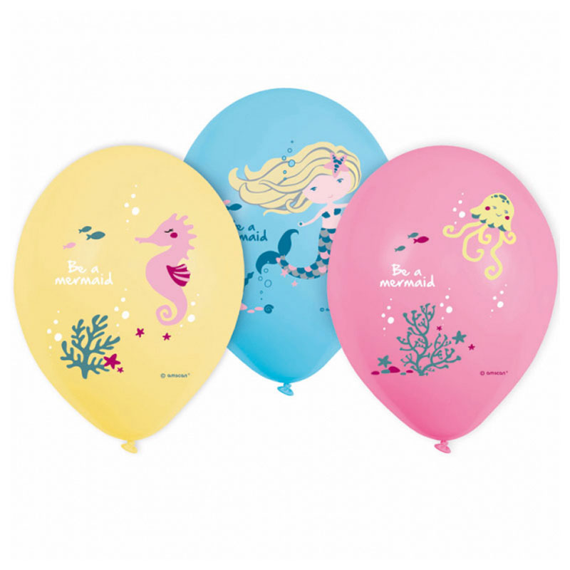 Ballonger Sjöjungfru innehåller 6 stycken ballonger i färgerna blå, gul och rosa. Ballongerna har en vacker sjöjungfru, sjöhästar, bläckfiskar och andra havsmotiv som tryck, samt texten "Be a mermaid". Ballongerna kan fyllas med helium eller luft.
