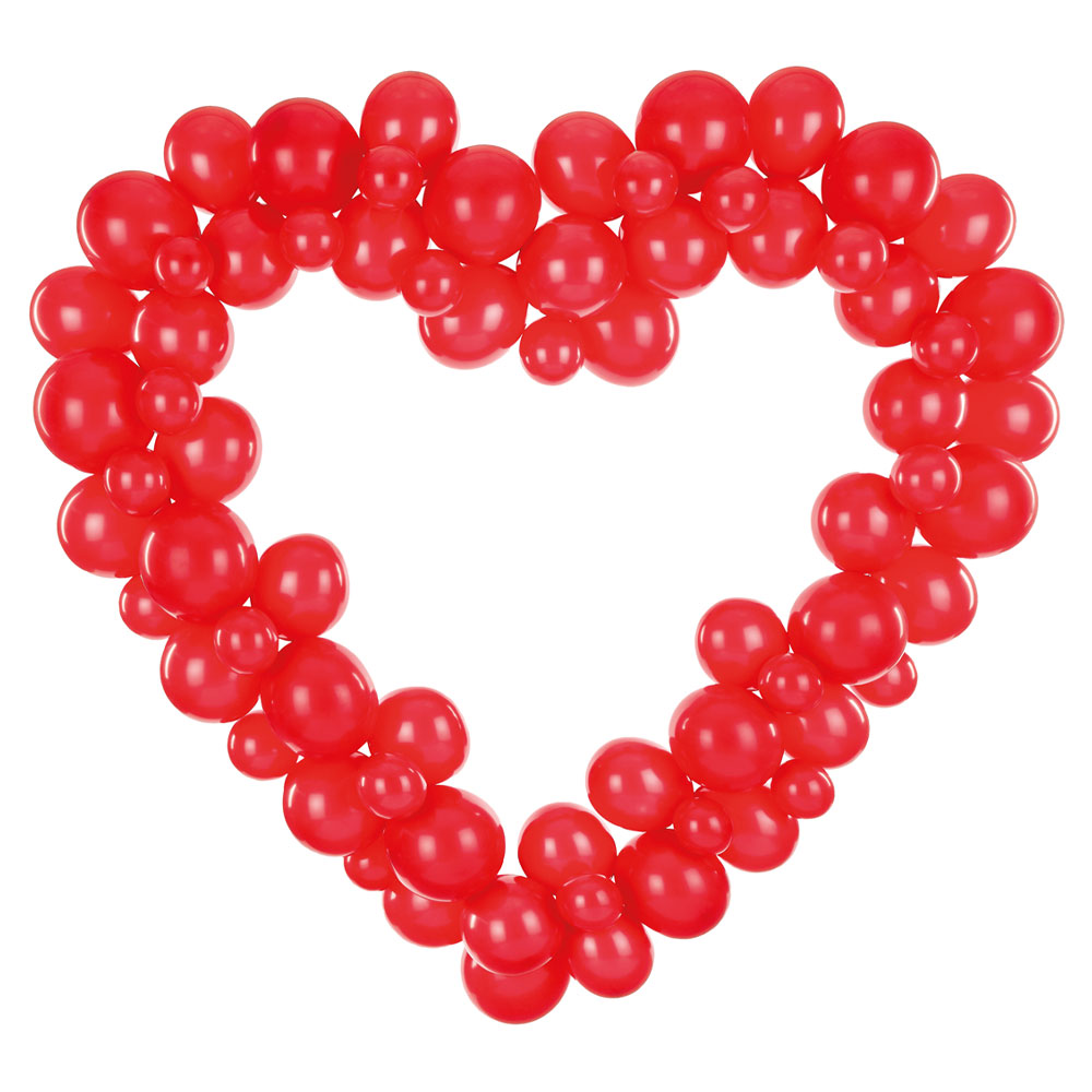 Ballonggirlang Hjärta Röd omfattar en ballonggirlang i form av ett rött hjärta av 68 stycken latexballonger. Ballongerna fylls med luft och du sätter själv ihop girlangen med hjälp av medföljande ballongband i kartong samt dubbelsidiga klistermärken. Ballonggirlangen blir ca 1,6 meter hög och 1,66 meter bred.
