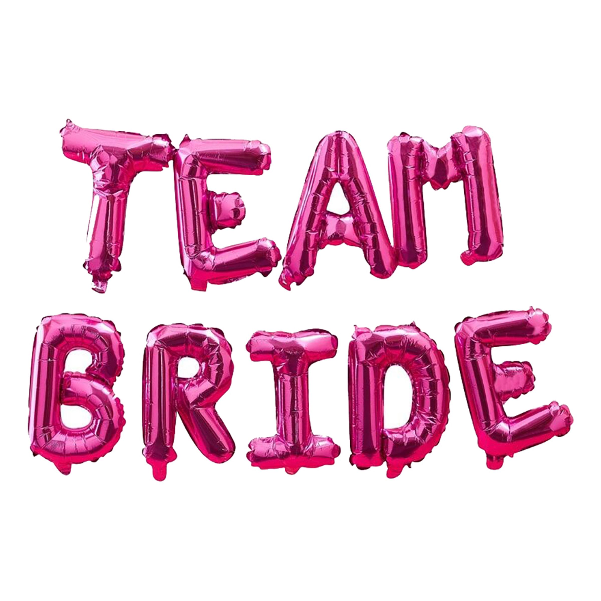 Ballonggirlang Team Bride Hot Pink är en girlang av rosa folieballonger som stavar ut orden "Team bride". Fyll ballongerna med luft som hålls kvar med hjälp av den självförslutande ventilen. Sätt sedan upp ballonggirlangen med det medföljande snöret.