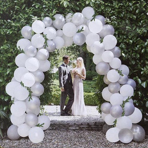 En ballongbåge är ett vackert inslag vid alla sorters festligheter, som t.ex. bröllop, dop och namngivning eller storartad trädgårdsfest! Denna ballonggirlang med vita och silvriga ballonger är perfekt som bröllopsbåge, entré till festen eller som bakgrund vid fotografering.