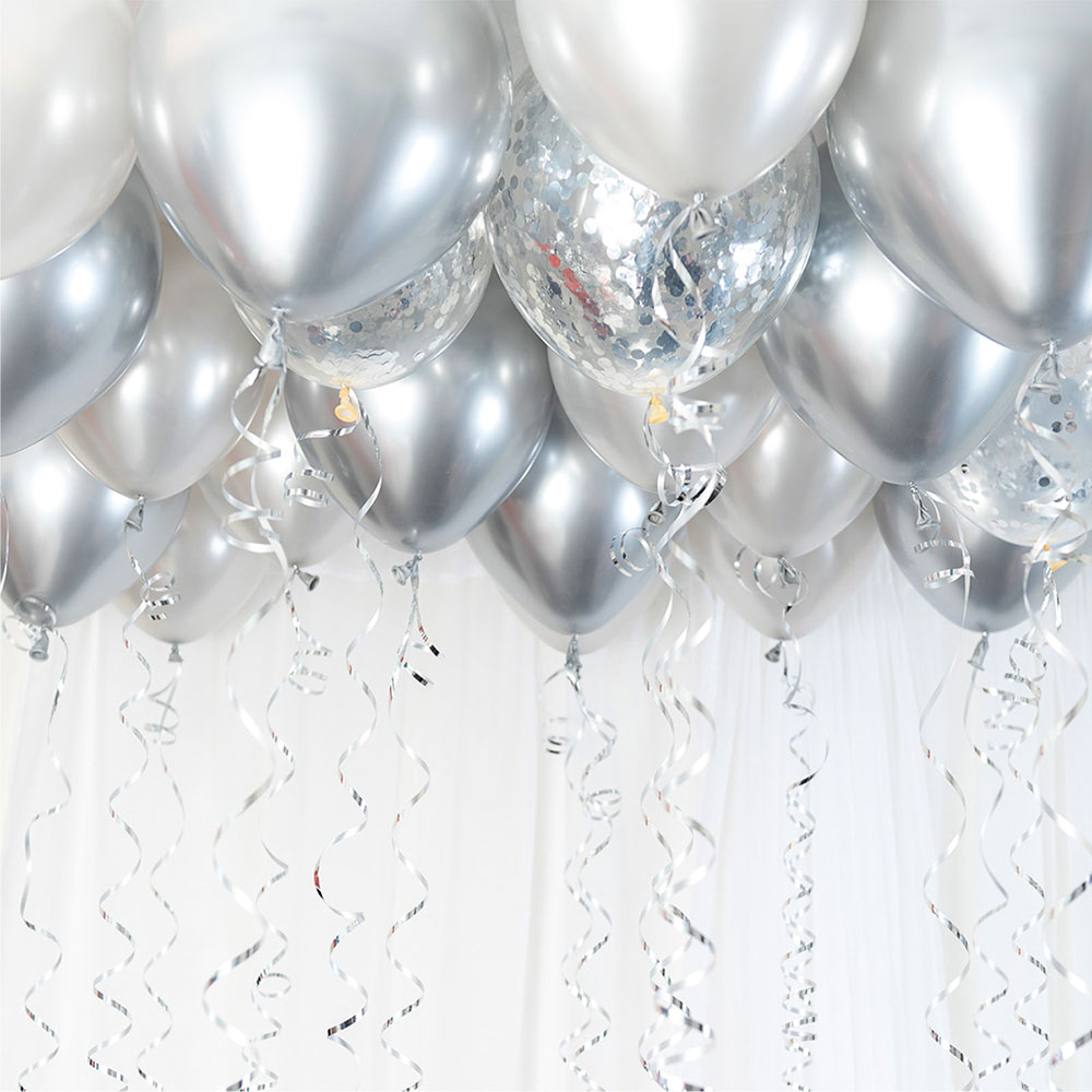 Ballongtak Kit Chrome Silver omfattar 30 stycken latexballonger, ballongsnöre, matchande ballongkonfetti samt glue dots. Blås upp ballongerna med helium och låt dem sväva uppe i taket eller blås upp dem med luft och fäst dem med glue dots.