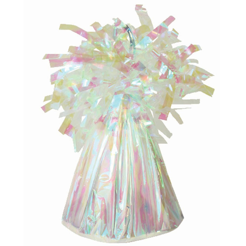 Ballongtyngd Regnbågsskimrande omfattar en tyngd inplastad i vackert regnbågsskimrande material med en smart plastcirkel man kan fästa ballongsnörena i.