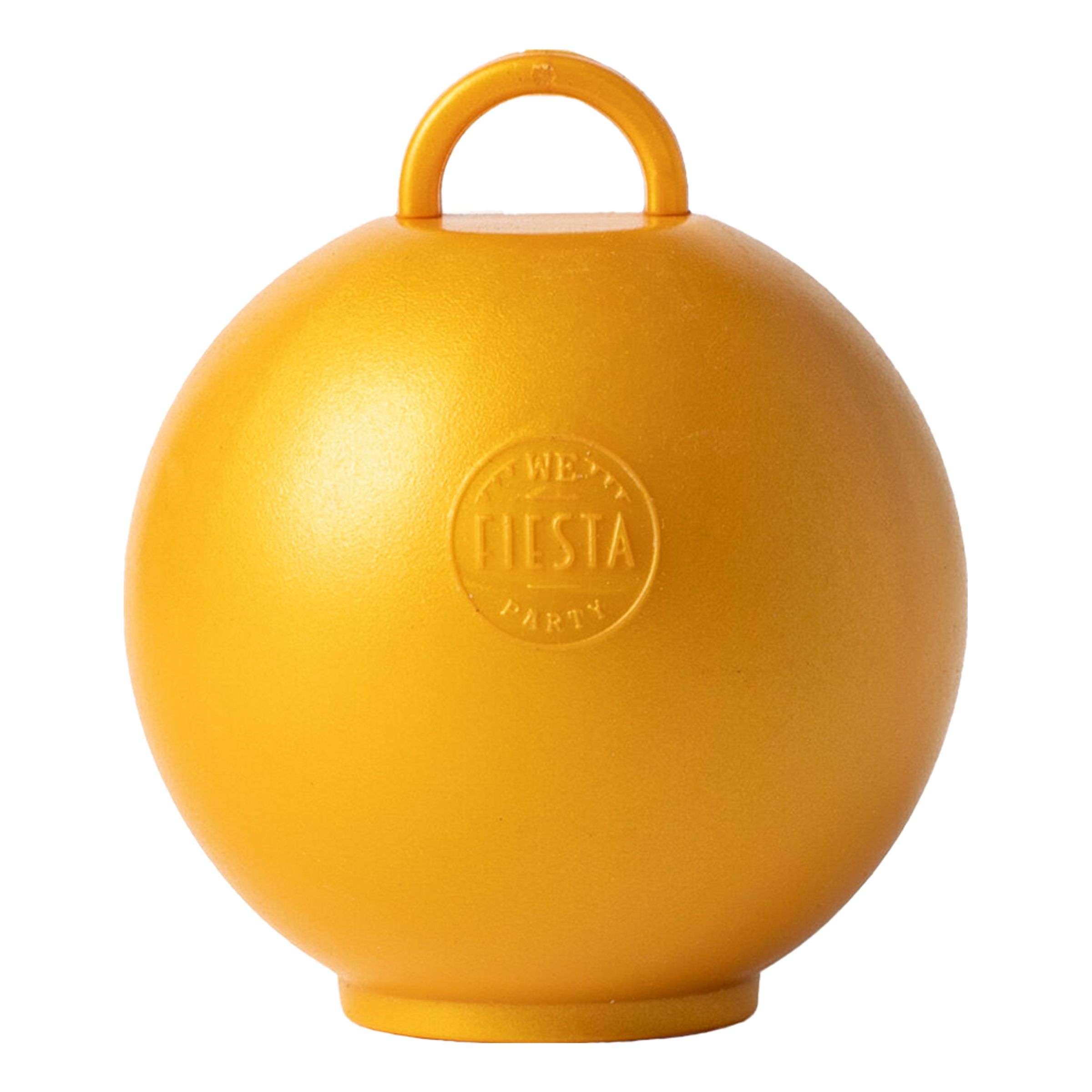 Ballongvikt Kettlebell Guld är en rund tyngd med handtag med ett litet runt tryck på framsidan. Ballongvikten orkar hålla ner cirka fyra vanliga latexballonger på 25-30 cm eller fem stycken vanliga folieballonger på 45 cm. Ballongsnören ingår inte.