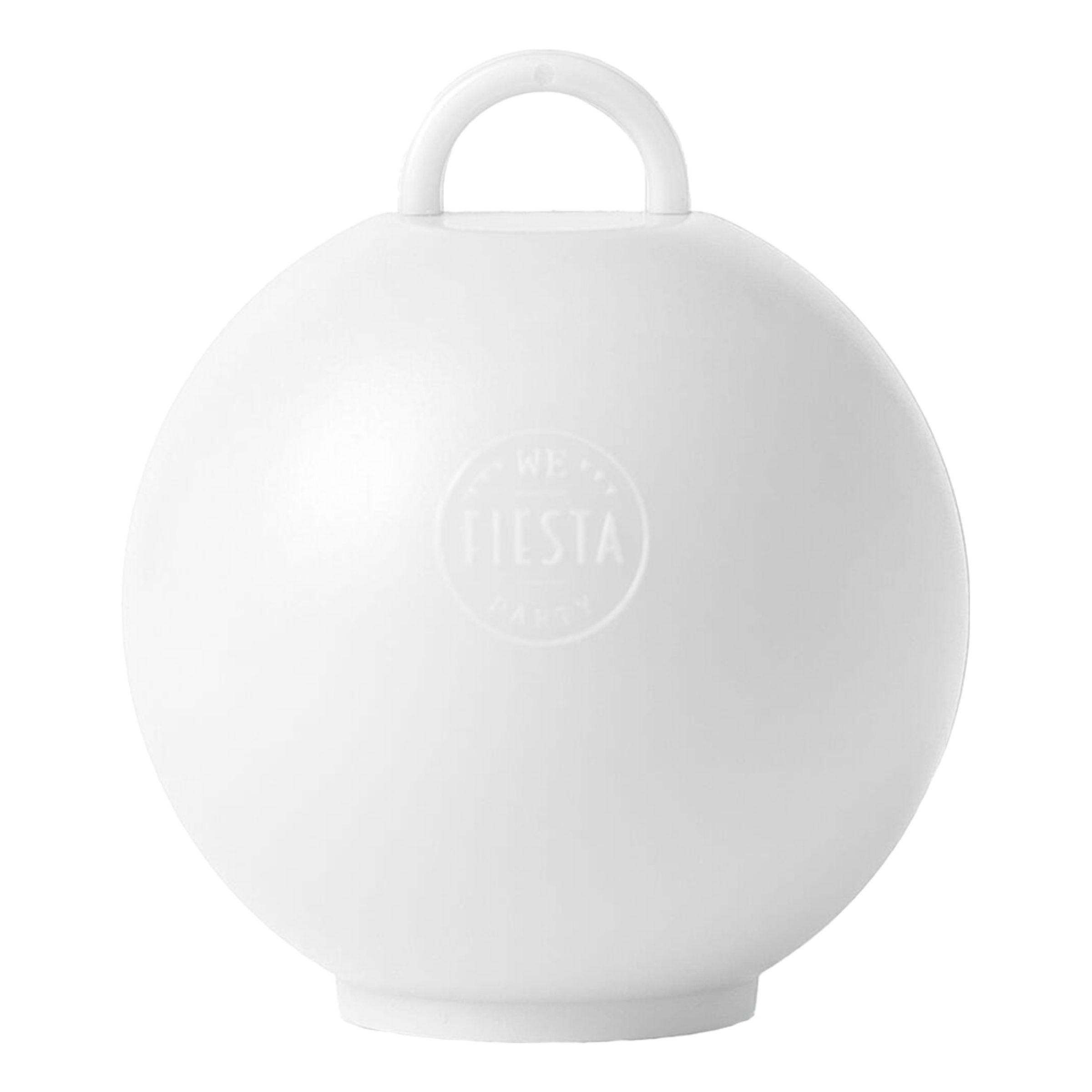 Ballongvikt Kettlebell Vit är en rund tyngd med handtag med ett litet runt tryck på framsidan. Ballongvikten orkar hålla ner cirka fyra vanliga latexballonger på 25-30 cm eller fem stycken vanliga folieballonger på 45 cm. Ballongsnören ingår inte.