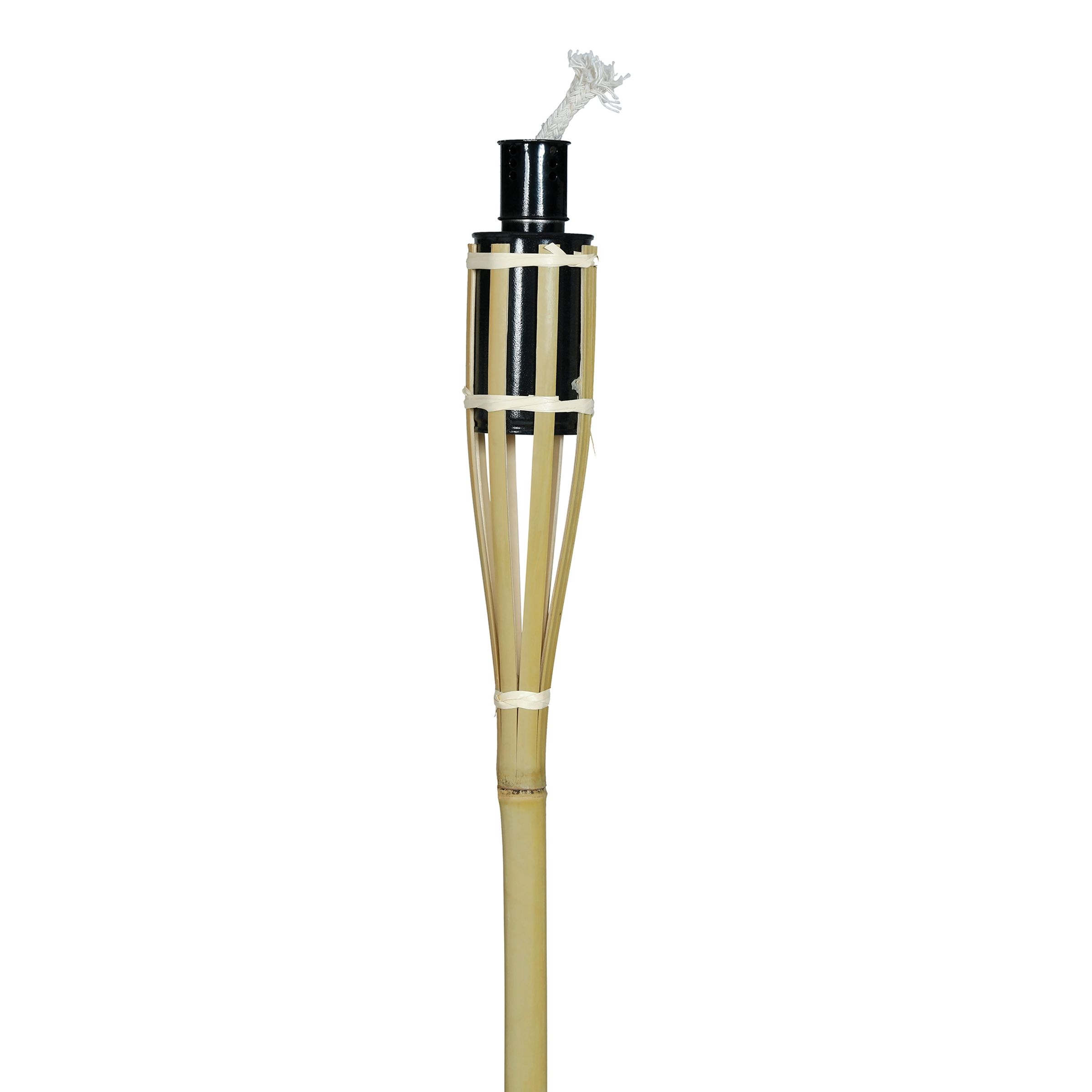 Bambufackla på Pinne består av en fotogenbehållare i svartlackad stål och veke av vitt snöre. Längst ner är staven spetsig för att du enkelt ska kunna trycka ner den i marken. Lampan brinner med hjälp av fotogen.