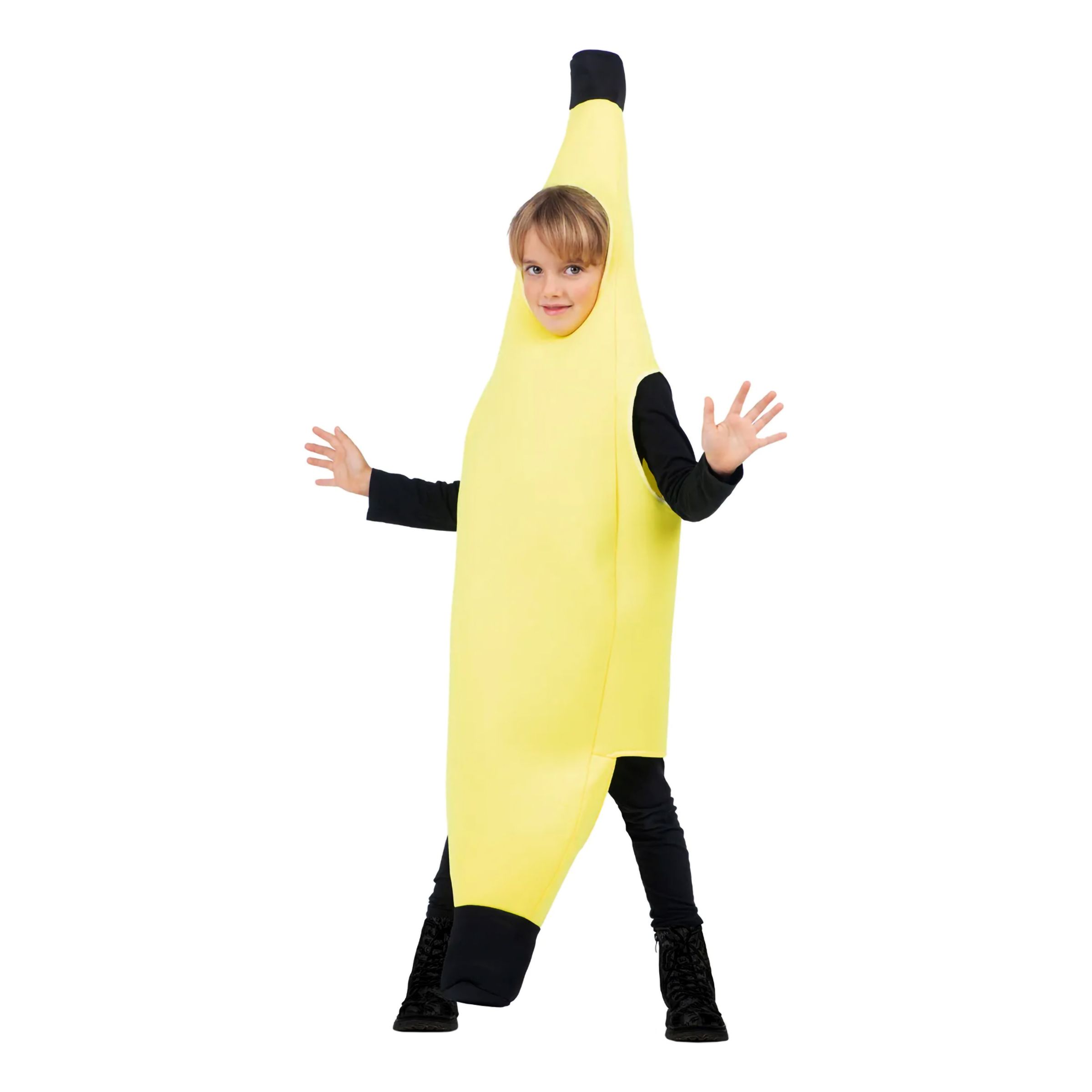 Banan Barn Maskeraddräkt är formad som en stor, gul banan och täcker hela kroppen. Den har en öppning för ansiktet i mitten, så barnet kan se och röra sig fritt. Dräkten är mjuk och vadderad.
