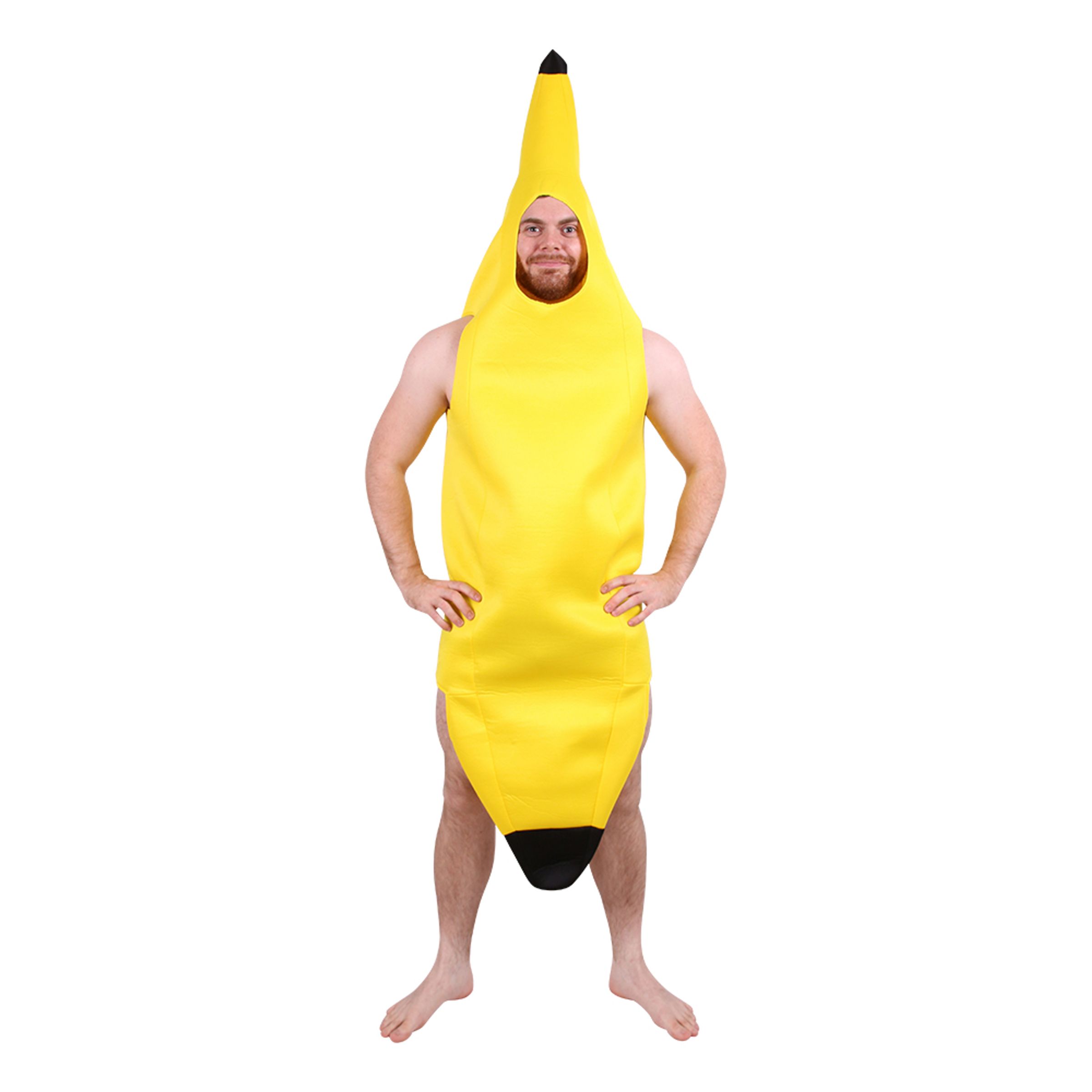 Banan Maskeraddräkt inkluderar en gul helkroppsdräkt komplett med topp och botten i svart tyg. Det är utskurna hål i ena änden av bananen så att du kan se ut och ha armarna fri. Basen i dräkten är öppen så att du kan röra dig fritt.