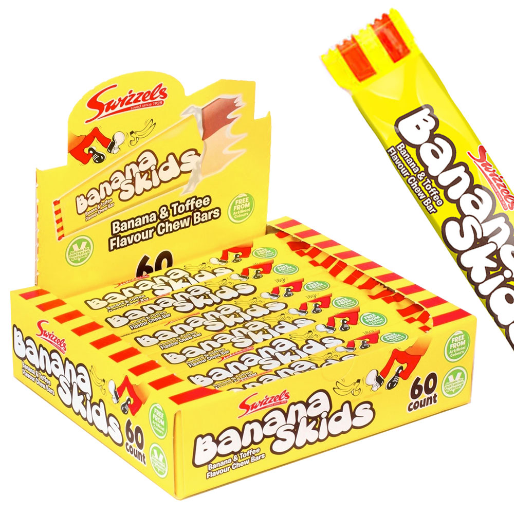 Jag tror dom flesta av oss minns att ha ätit Banana Skids godis när vi var små, kanske från kiosken nära skolan eller i lördagsgodispåsen man fick av morsan. Det heter Banana skids just för att dom smakar banan. Dessutom är dom gula! Men till skillnad från riktiga bananskal (som banana skids betyder) så kommer du inte halka på dessa!