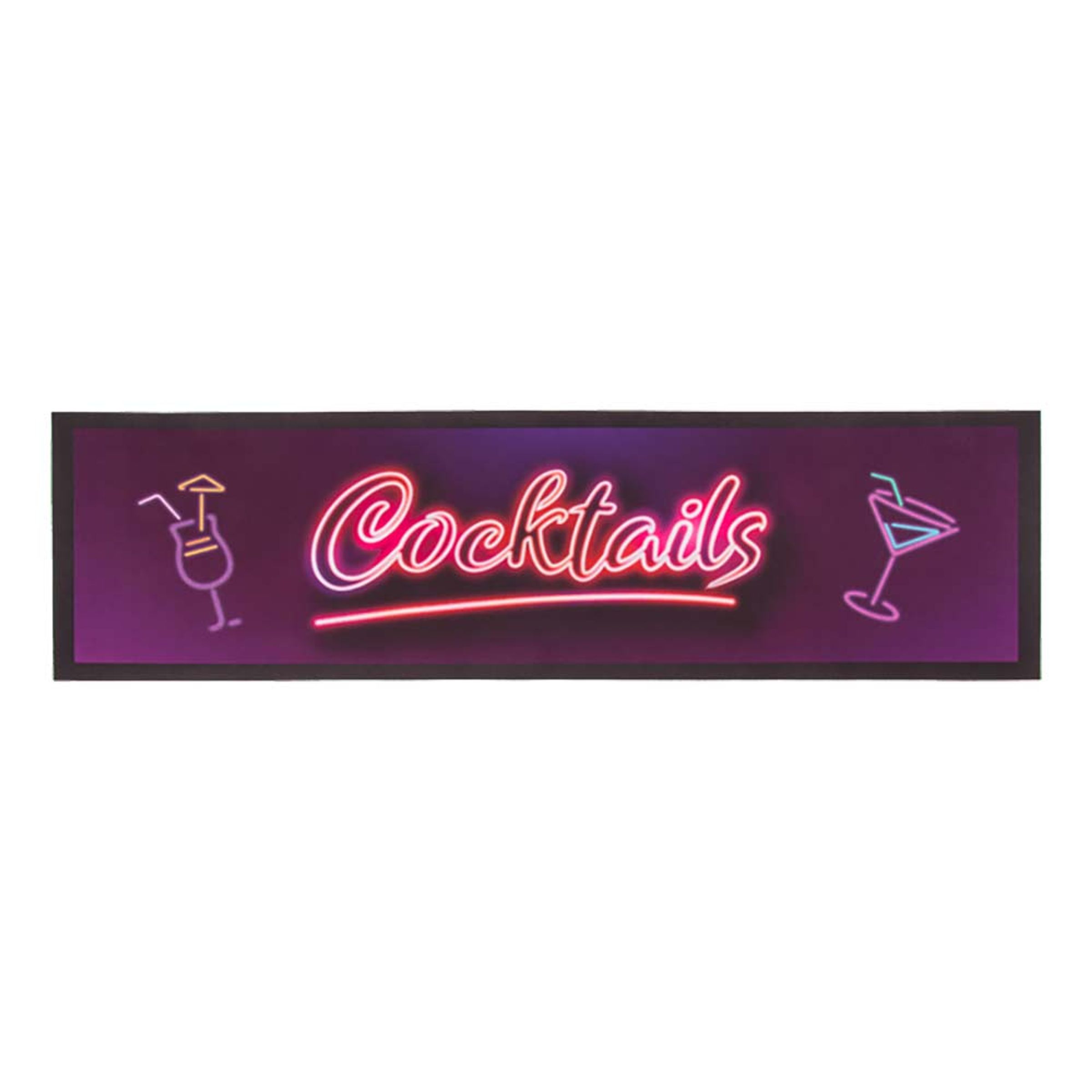 Barmatta Cocktails inkluderar en svart barmatta, med motiv föreställande två cocktailglas och texten "Cocktails" skrivet i neondesign, som effektivt hjälper dig att hålla hemmabaren fri från spill och väta. Barmattan är tillverkad av gummi vilket gör att mattan får bra grepp och alltid stannar på plats.