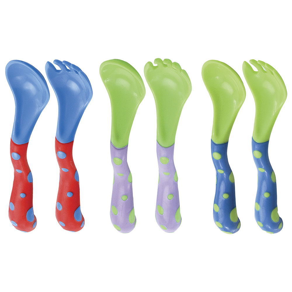 Barnbestick 13,5 cm 2-pack omfattar en sked och en gaffel, färgerna väljer vi ut slumpmässigt (blå/röd, grön/lila eller grön/blå).
