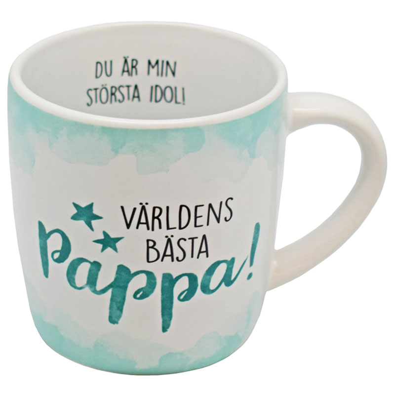 Bästa Pappan Mugg innehåller en mugg i porslin med gröna detaljer och texten "Världens Bästa Pappa" på utsidan och "Du är min största idol!" på insidan.