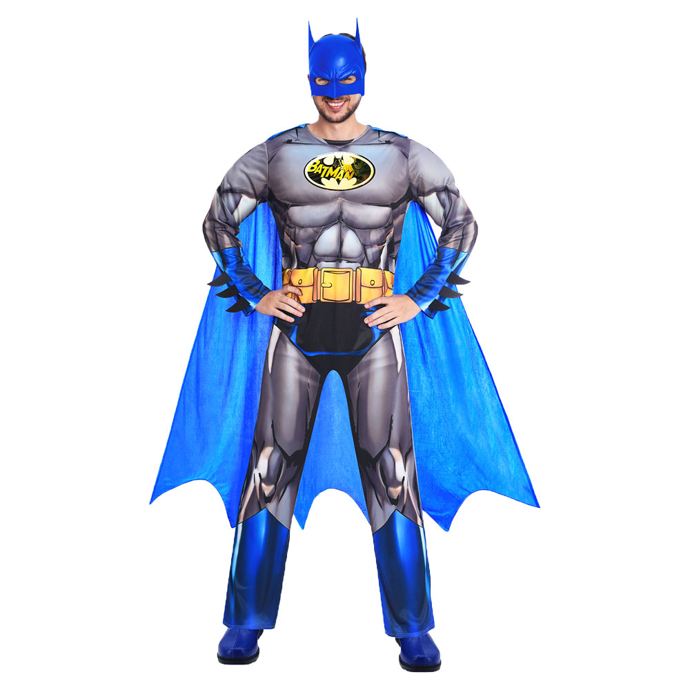 Batman Dräkt Brave & Bold omfattar en vadderad Batman helkroppsdräkt med mantel och häftigt 3D-Batman motiv på bröstet. Ingår även en blå 3D-mask som täcker halva ansiktet. Masken fästs med hjälp av elastiskt band. Dräkten är tillverkad av plast och polyester och passar vuxna.