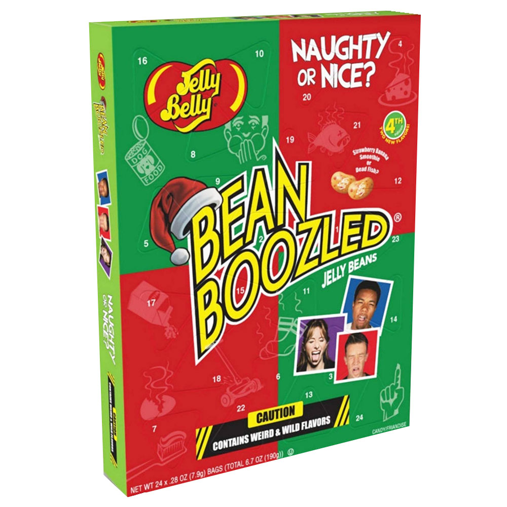 Bean Boozled Adventskalender består av en adventskalender fylld med bean boozled bönor som kan vara antingen goda eller äckliga, smakerna finns beskrivna på baksidan.