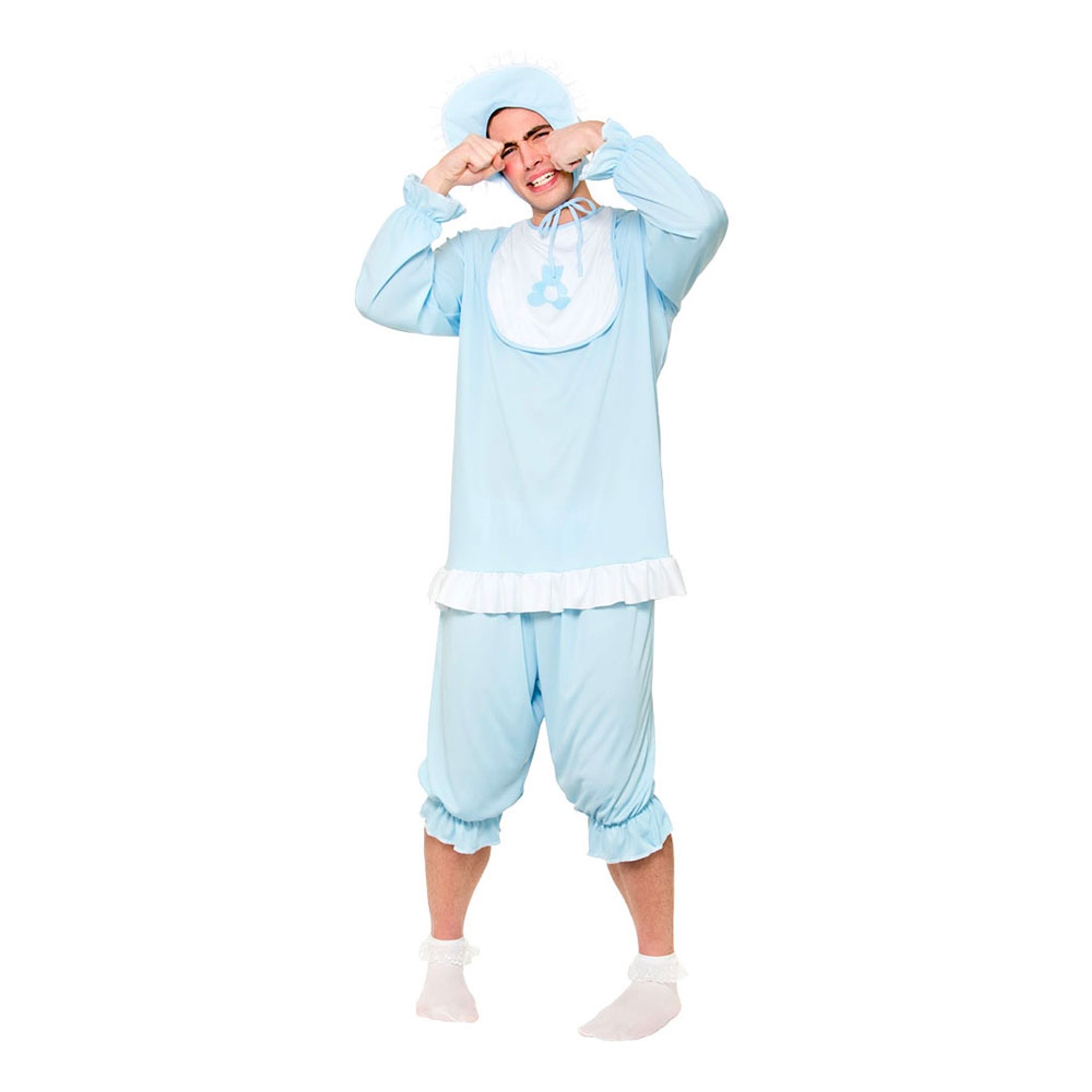 Bebis Blå Maskeraddräkt inkluderar en ljusblå tröja med volanger vid muddar och längs nederkanten samt en vit haklapp med en nallebjörn på. Ingår gör även ett par matchande ljusblå byxor och en bebismössa som knyts under hakan.
