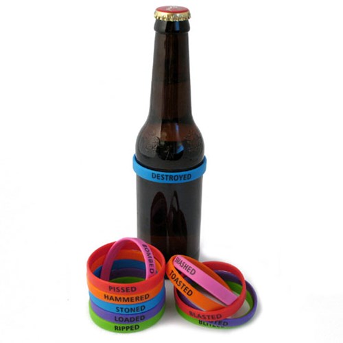 Banden är gjorda av färglatt gummi och passar nästan alla ölflaskor och burkar (och även handleder om man så önskar!).