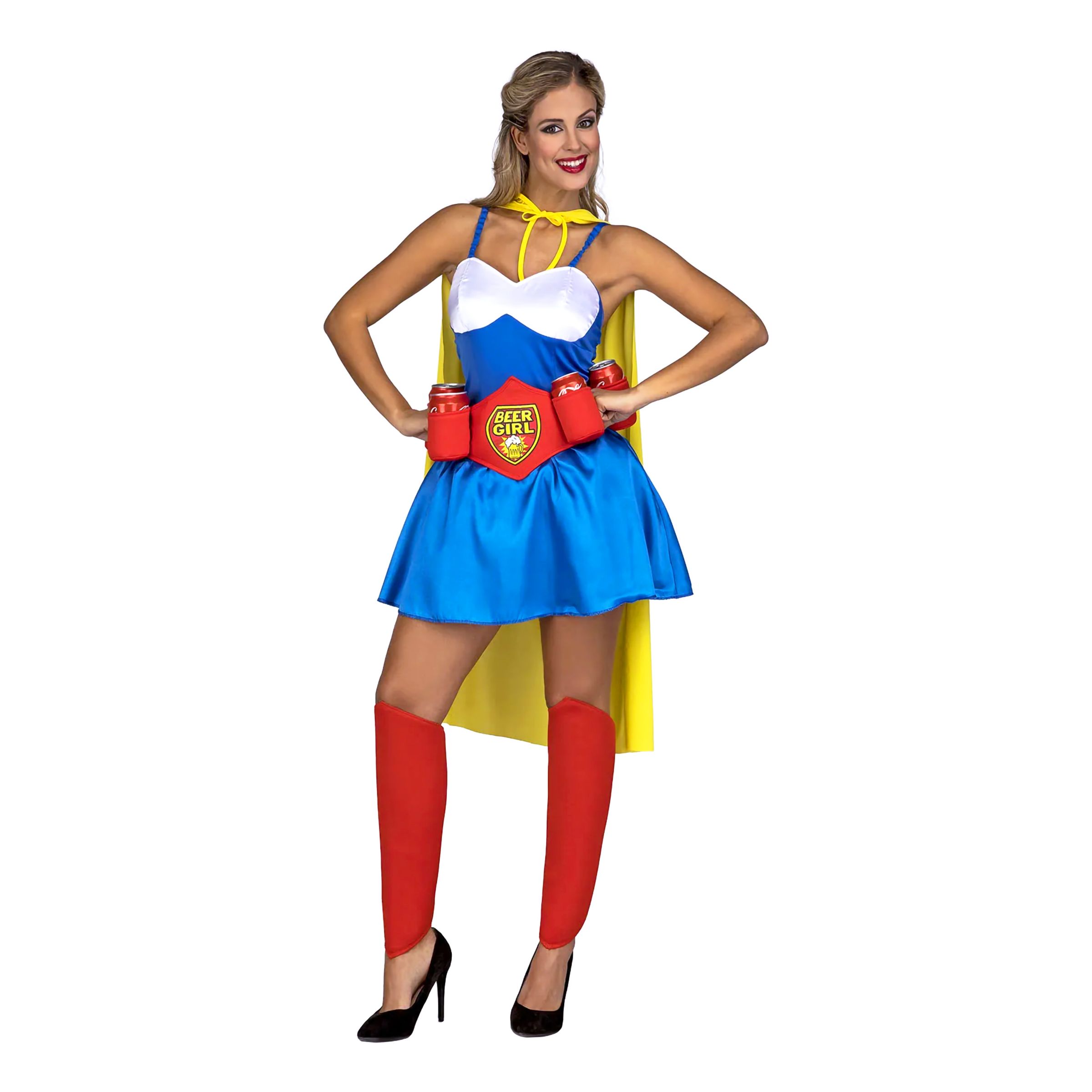 Rädda festens brist på öl iklädd denna läckra Beer Girl dräkt! Med en superhjältelook i blått, rött och gult blir du kvällens mest uppskattade gäst. Och det bästa? Bältet har plats för två ölburkar, så du alltid har förfriskningar nära till hands!