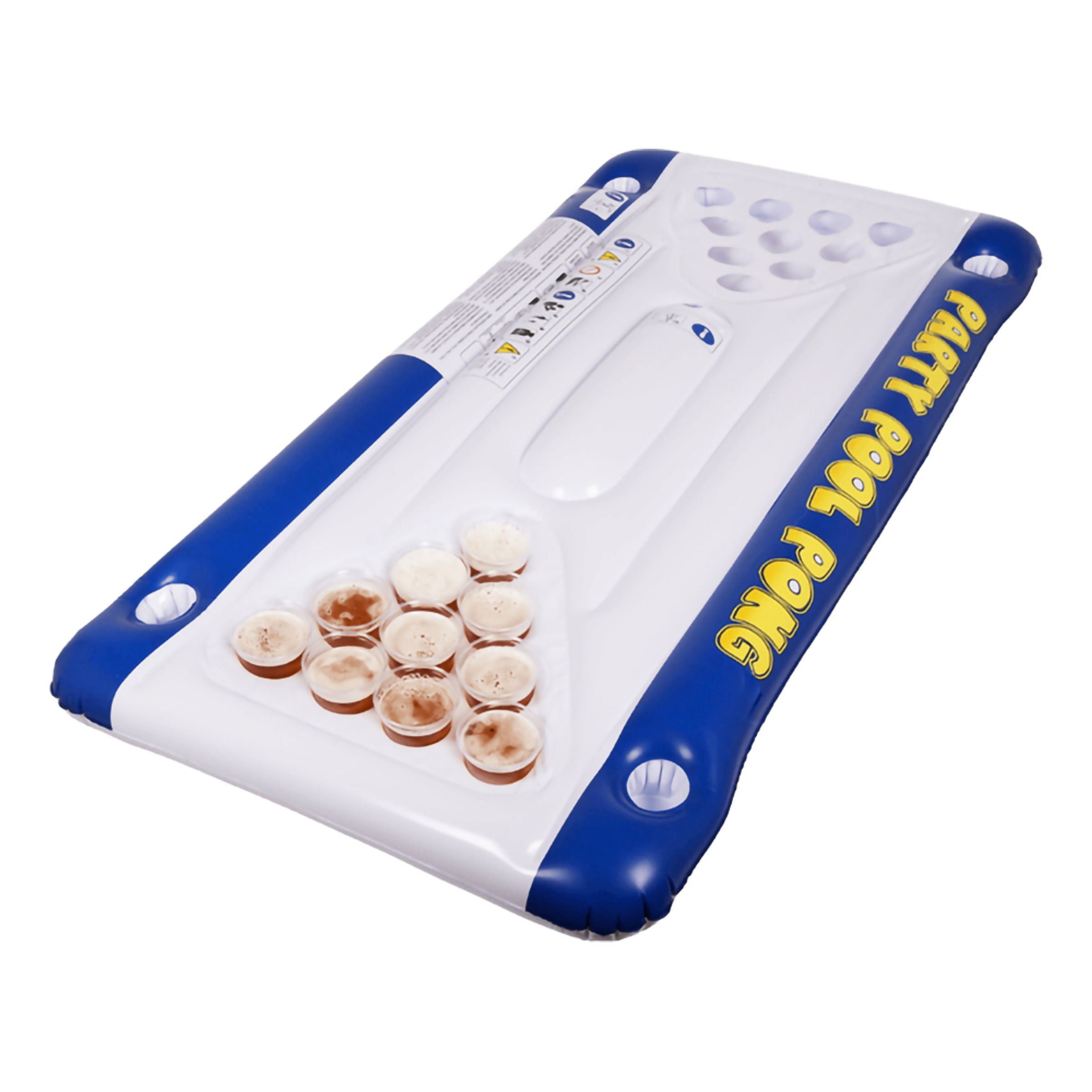 Beer Pong Set med Flytmadrass mäter 152 x 76 x 15 cm och har 20 stycken hål för muggar som du fyller med valfri dryck. Perfekt aktivitet på poolpartyn, utomlandssemestrar och lata dagar på stranden! It's time for party pool pong!