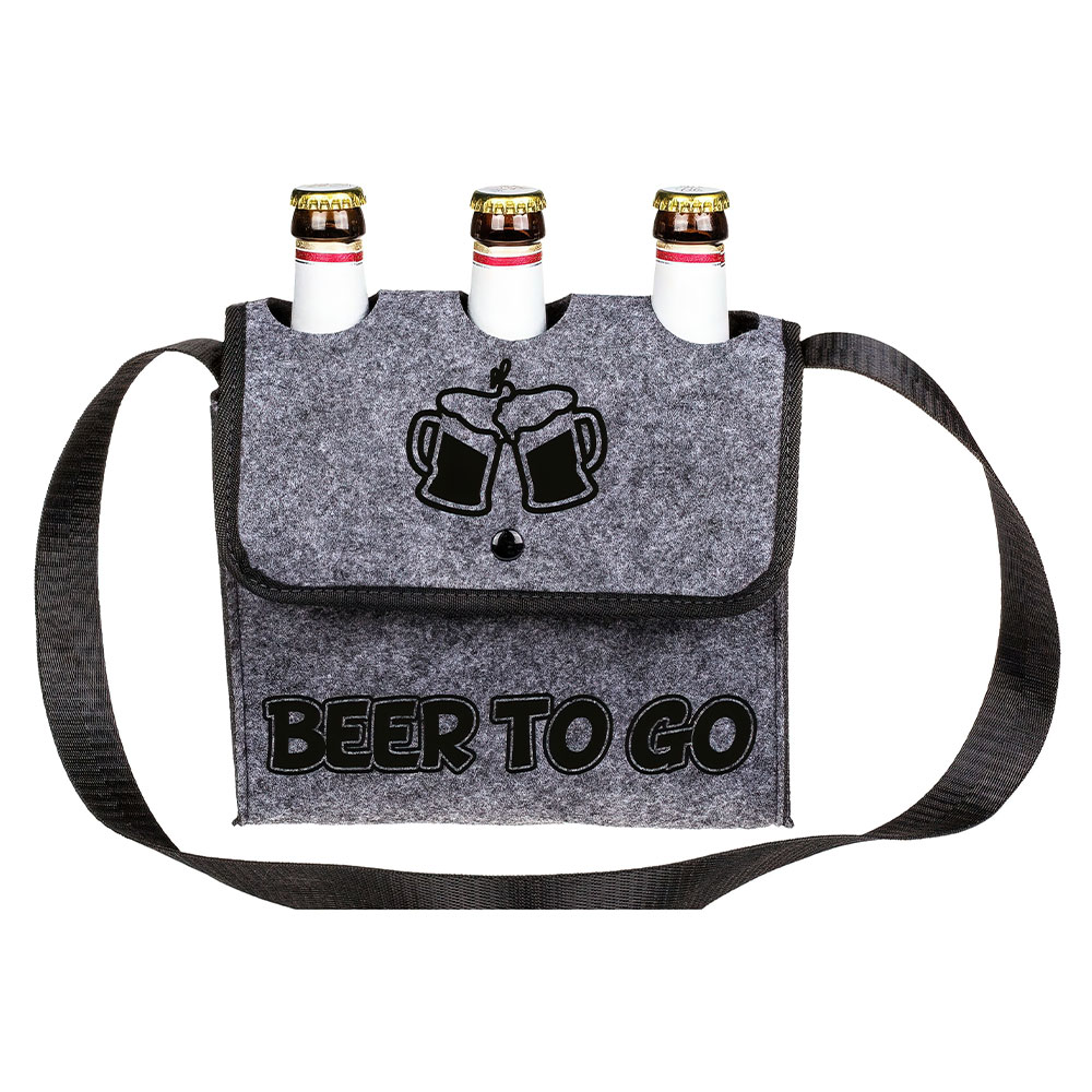 Beer to Go Flaskväska består av en axelväska med plats för tre stycken 0,33 liters flaskor. Väskan är gjord av filt och locket stängs med en tryckknapp.