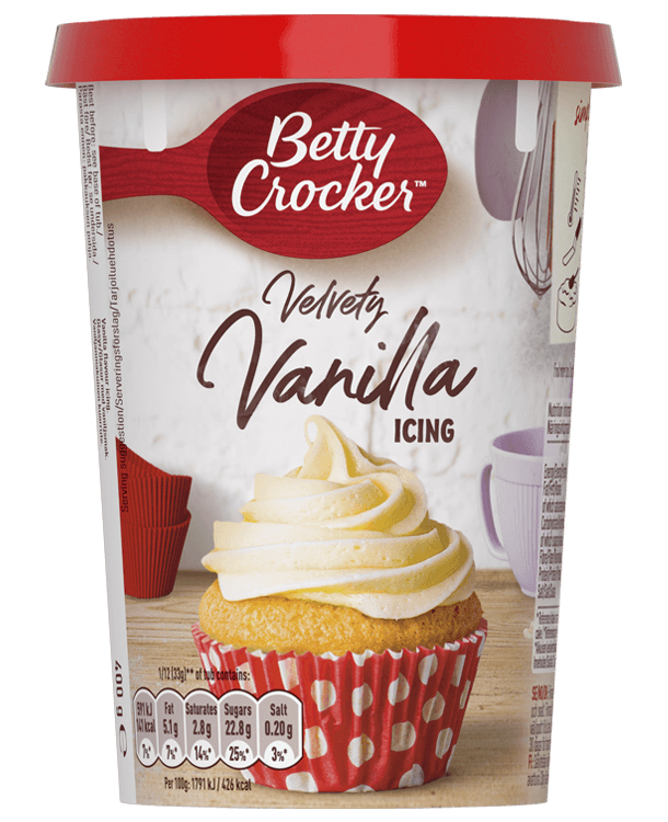 Färdig att smeta ut. Varje burk innehåller tillräckligt med glasyr för att täcka och fylla en 8-tums kaka (till 12 serveringar) eller täcka upp till 27 muffins.