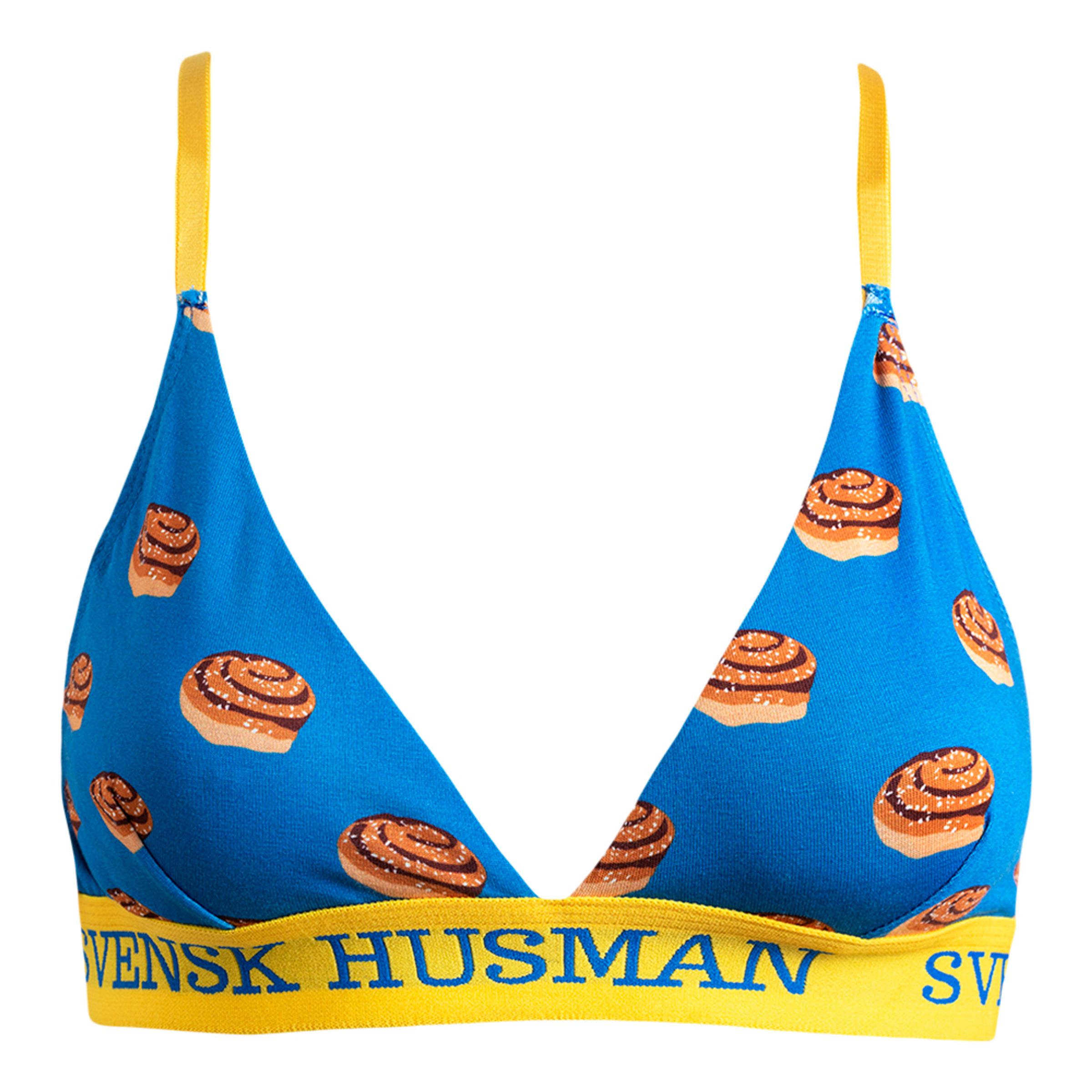 BH Kanelbulle är en mjuk och bekväm BH med motiv av kanelbullar och tryckt med texten "Svensk Husman". BH'n kommer i blå färg med gult, elastiskt resårband och justerbara axelband. En mycket smakfull och rolig present att ge till din dam på Mors Dag eller som födelsedagspresent. Köp gärna till ett par matchande trosor!