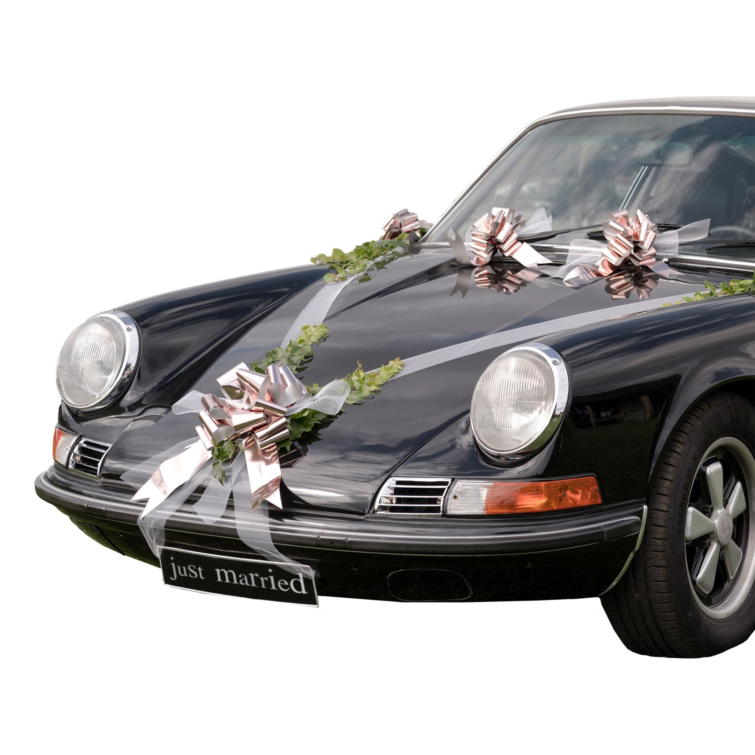 Bildekoration Bröllop Roséguld inkluderar ett kit i roséguld att dekorera bröllopsbilen med! Här får du med 1 rulle tyllband, 4 mindre pull bow-rosetter samt 1 pull bow-rosett! Gröna blad ingår inte.
