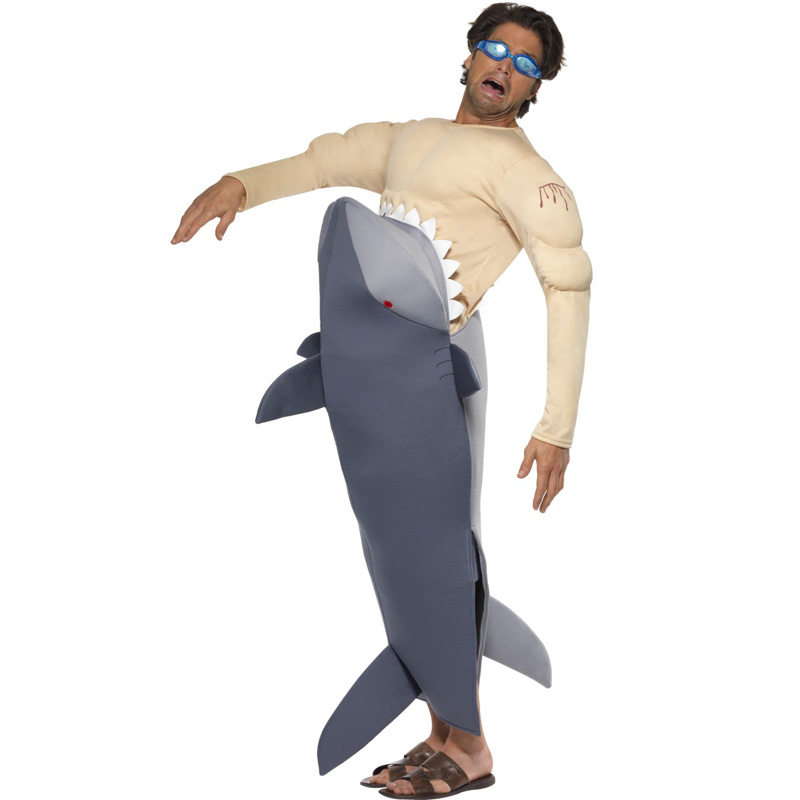 Hoppa in i vattnet med denna maskeraddräkt och plaska samtidigt som du skriker på hjälp! Folk lär tro att hajar tagit sig in i området! När allt gått ur kontroll och folket grips av panik säger du lite lätt "It's just a prank"…. följt av att du springer iväg riktigt snabbt.