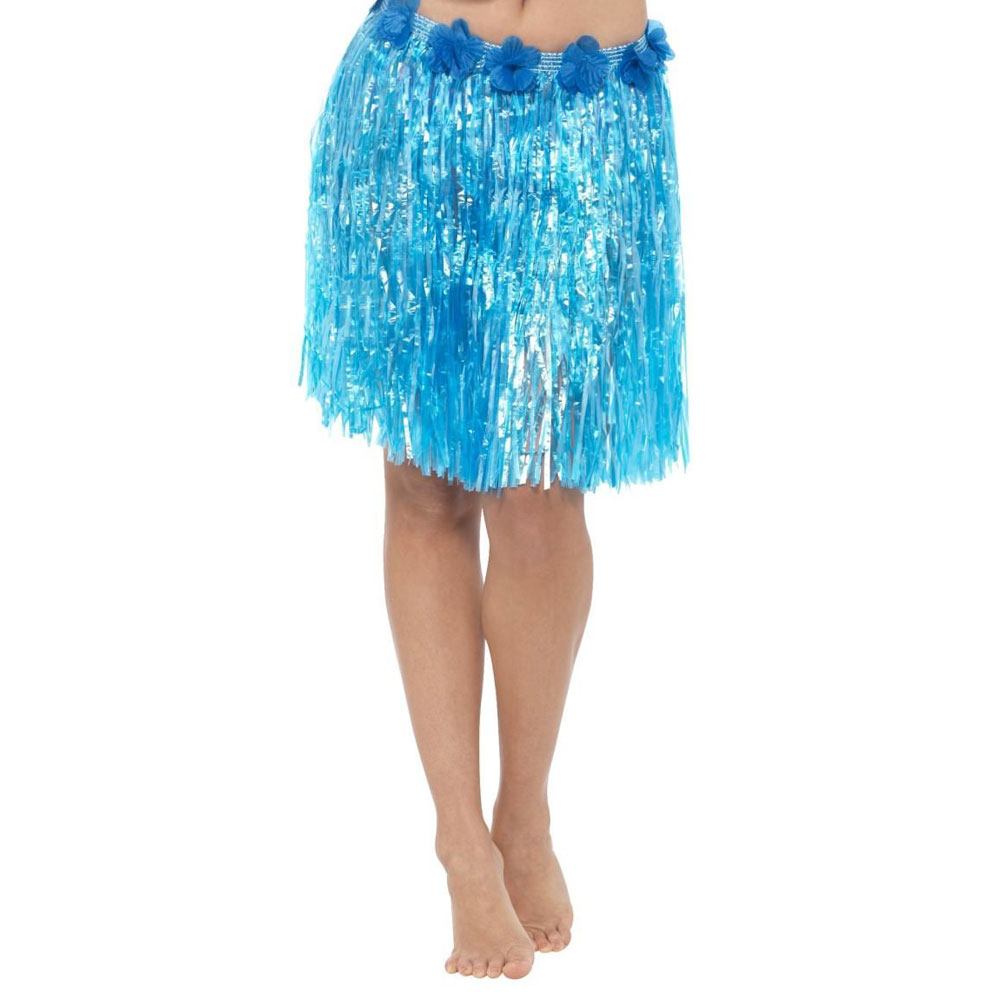 Blå Hawaii Kjol innehåller en blå hula hula kjol med fransar och blåa blommor.