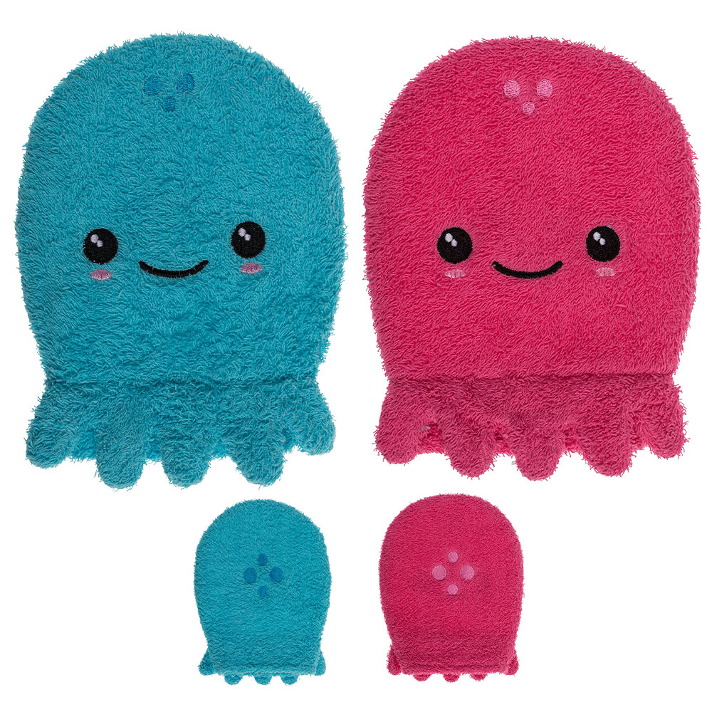 Bläckfisk Tvätthandske omfattar en tvättvante formad som en söt leende bläckfisk. Bläckfisken finns som antingen rosa ell ljusblå och vilken du får blir en överraskning.
