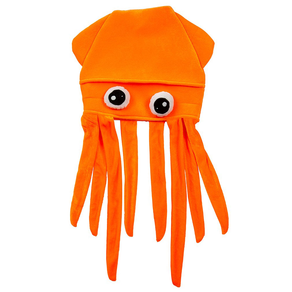Bläckfiskhatt omfattar en maskeradhatt som föreställer en orange bläckfisk med stora ögon och åtta långa tentakler.