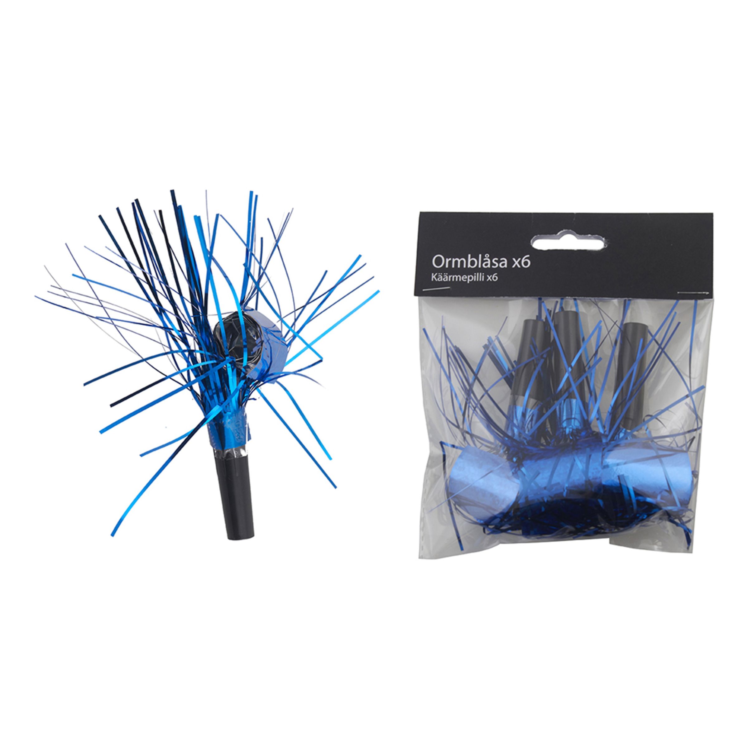 Blåsormar Laser Blå/Svart inkluderar en förpackning med sex stycken tutor. Tutorna är blåa med svarta munstycken och de har en festlig design med remsor. De är tillverkade i plast.